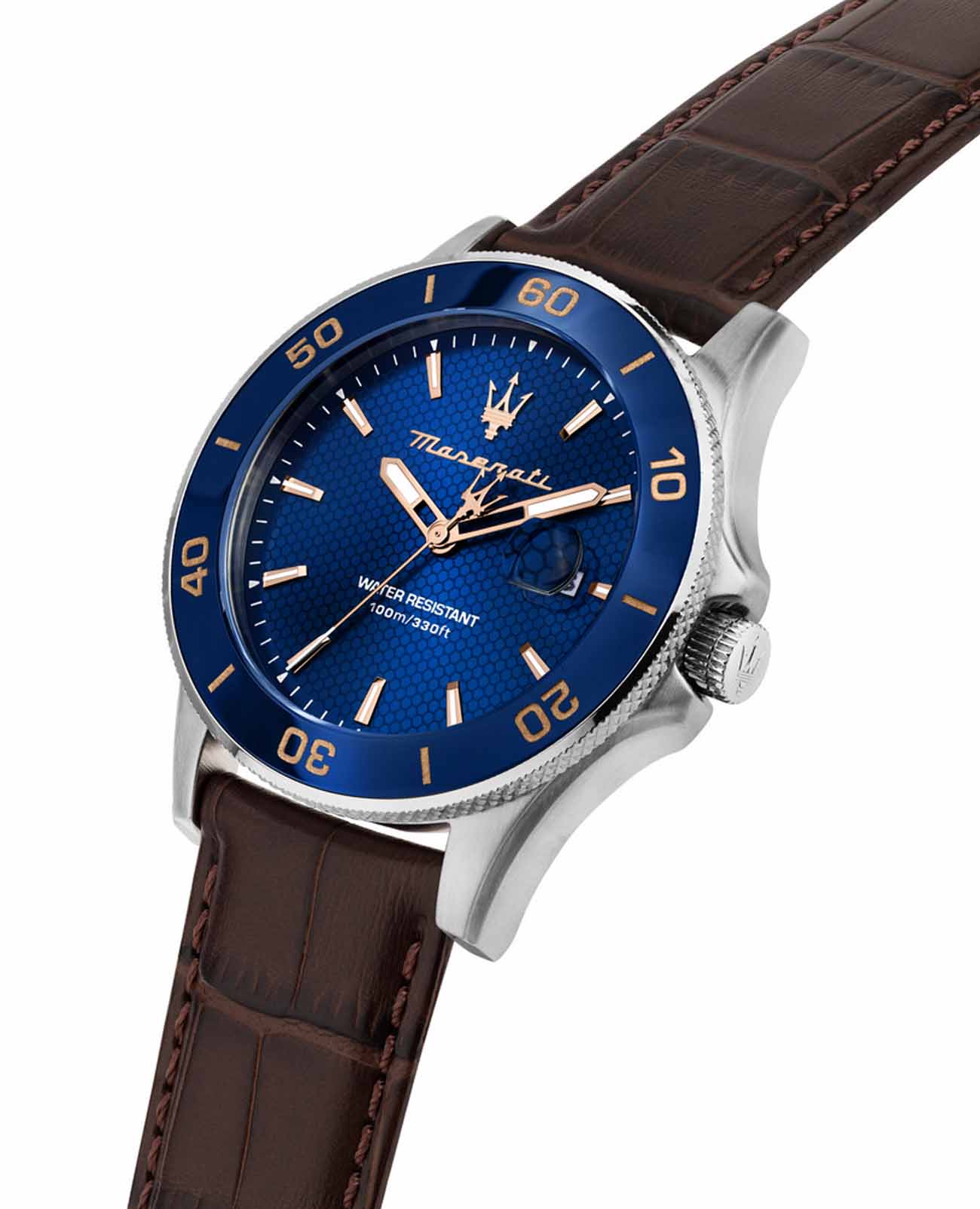 Мужские итальянские часы Maserati Competizione R8851100004, кварцевый механизм с высокой точностью. Корпус часов изготовлен из стали. БезельБезельВнешний ободок, закрепляющий стекло. В спортивных часах так называется поворотное кольцо с делениями на циферблате, выполняет роль таймера – замеряет отрезки времени на шкале. Неподвижный безель – элемент декора. Однонаправленно вращающийся безель на дайверских часах позволяет фиксировать моменты погружения и выныривания на поверхность. из стали с PVD-покрытиемPVDУльтратонкое покрытие наносится в технике вакуумного напыления, сочетает в себе нитрид титана особой прочности со слоем золота или оксида хрома. Несёт в себе декоративную или защитную функцию.. Стрелки с люминесцентным покрытиемЛюминесцентное покрытиеПозволяет считывать показания времени в темноте. Производители наносят на стрелки, часовые индексы, безель или поверхность циферблата светонакопительный состав, дающий холодное свечение.. Окошко даты находится в положении 3 часа. Класс водозащиты: 100 метров, позволит плавать, нырять и заниматься другими водными видами спорта. Кожаный ремешок на стандартной застежке.