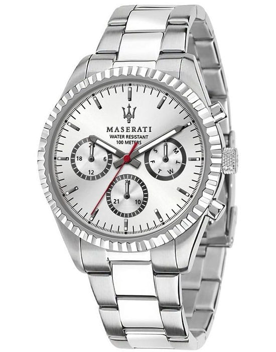 Мужские часы с хронографом Maserati COMPETIZIONE R8853100018, кварцевый механизм с высокой точностью. Класс водозащиты: 100 метров, позволит плавать, нырять и заниматься другими водными видами спорта. Корпус часов изготовлен из стали, серебристого цвета.