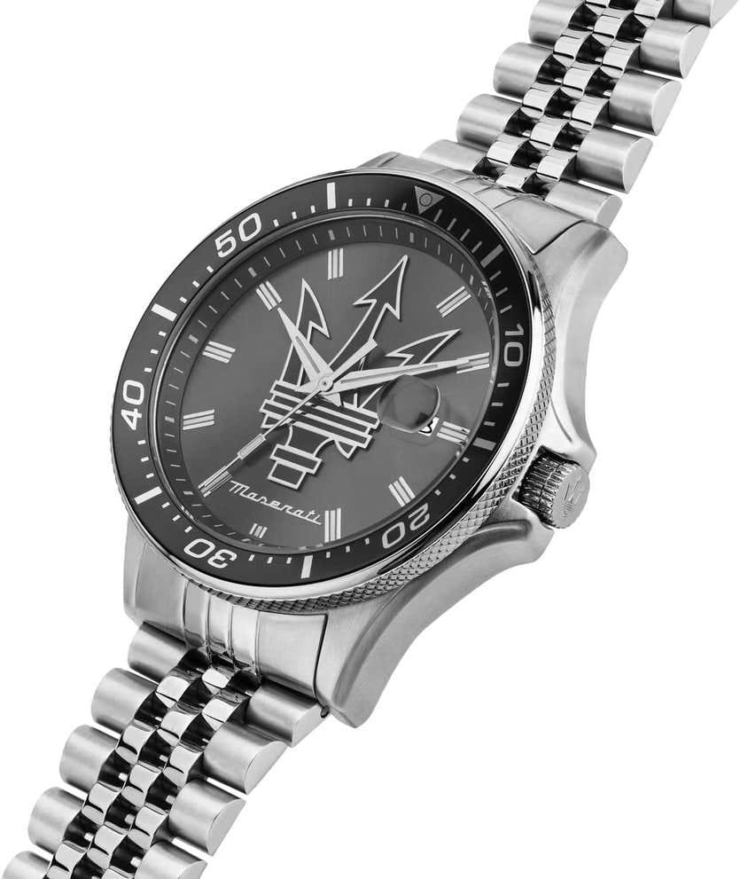 Модель Maserati Sfida R8853140010 — воплощение стиля и функциональности для современных мужчин, ценящих качество и элегантность. Корпус диаметром 44 мм выполнен из нержавеющей стали, обеспечивая прочность и долговечность. Минеральное стеклоМинеральное стеклоМинеральное стекло представляет собой искусственно выращенный минерал кварца. Такое стекло отличается особой устойчивостью к повреждениям и царапинам. Уступает по некоторым качествам сапфировому стеклу. надежно защищает синий циферблат с изящными рисками, придавая часам утонченный вид. Благодаря водостойкости до 100 метров (10 АТМ), эти часы станут вашим надежным спутником в любых условиях, будь то деловая встреча или активный отдых. Люминесцентное покрытиеЛюминесцентное покрытиеПозволяет считывать показания времени в темноте. Производители наносят на стрелки, часовые индексы, безель или поверхность циферблата светонакопительный состав, дающий холодное свечение. на стрелках и метках обеспечивает отличную видимость в темноте. Завершающий штрих — стальной браслет с раскладной застёжкойРаскладная застёжкаТакой тип застёжки используется только на браслетах из металла. Она никогда не раскрывается полностью, происходит разделение на 2 и более частей. Раскладывающая застёжка снизит вероятность потери часов к минимуму., который подчеркивает общий стиль, обеспечивая комфорт и надежность в носке. Вращающийся стальной безельБезельВнешний ободок, закрепляющий стекло. В спортивных часах так называется поворотное кольцо с делениями на циферблате, выполняет роль таймера – замеряет отрезки времени на шкале. Неподвижный безель – элемент декора. Однонаправленно вращающийся безель на дайверских часах позволяет фиксировать моменты погружения и выныривания на поверхность. с IP-покрытиемIP-покрытиеМетод ионного напыления. Демонстрирует повышенную устойчивость к истиранию, окислению и химическим веществам. Под воздействием высокого давления и температуры около 1500°C молекулы металла надёжно соединяются с частицами корпуса часов.. Циферблат выполнен по технологии Sunray (солнечные лучи) и украшен фирменным логотипом «Maserati». Метки в виде штрихов. Окошко даты с увеличительным стеклом находится в положении 3 часа.