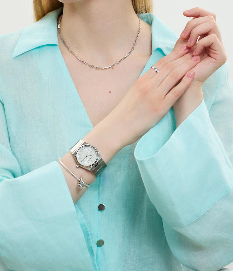 Женские кварцевые часы Mathey-Tissot Zoltan D117AS — это стильное сочетание элегантности и современного дизайна. Изящный корпус выполнен из нержавеющей стали, диаметром 34 мм, что придаст образу женственности и романтизма. Изысканный циферблат с метками в виде штрихов придает модели особый блеск. Циферблат защищен сапфировым стекломСапфировое стеклоПрочный и надёжный материал из кристалла сапфира синтетического происхождения, характеризующийся особой твёрдостью и устойчивостью к царапинам и повреждениям., обеспечивающий устойчивость к царапинам. Стрелки и метки с люминесцентным покрытиемЛюминесцентное покрытиеПозволяет считывать показания времени в темноте. Производители наносят на стрелки, часовые индексы, безель или поверхность циферблата светонакопительный состав, дающий холодное свечение.. Окошко даты находится в положении 3 часа. Часы оснащены надежным кварцевым механизмом. Стальной браслет на застёжке-бабочке с кнопкамиЗастёжка "бабочка"Такой вид застёжки дополняется предохранителями, помогающими избежать случайного раскрытия браслета. Обладают изящным исполнением. , гарантирует комфортное и безопасное ношение. Класс водозащиты: 50 метров позволит защитить корпус от случайных брызг или капель дождя. Mathey-Tissot — отличный выбор для тех, кто ценит утонченность и качество.