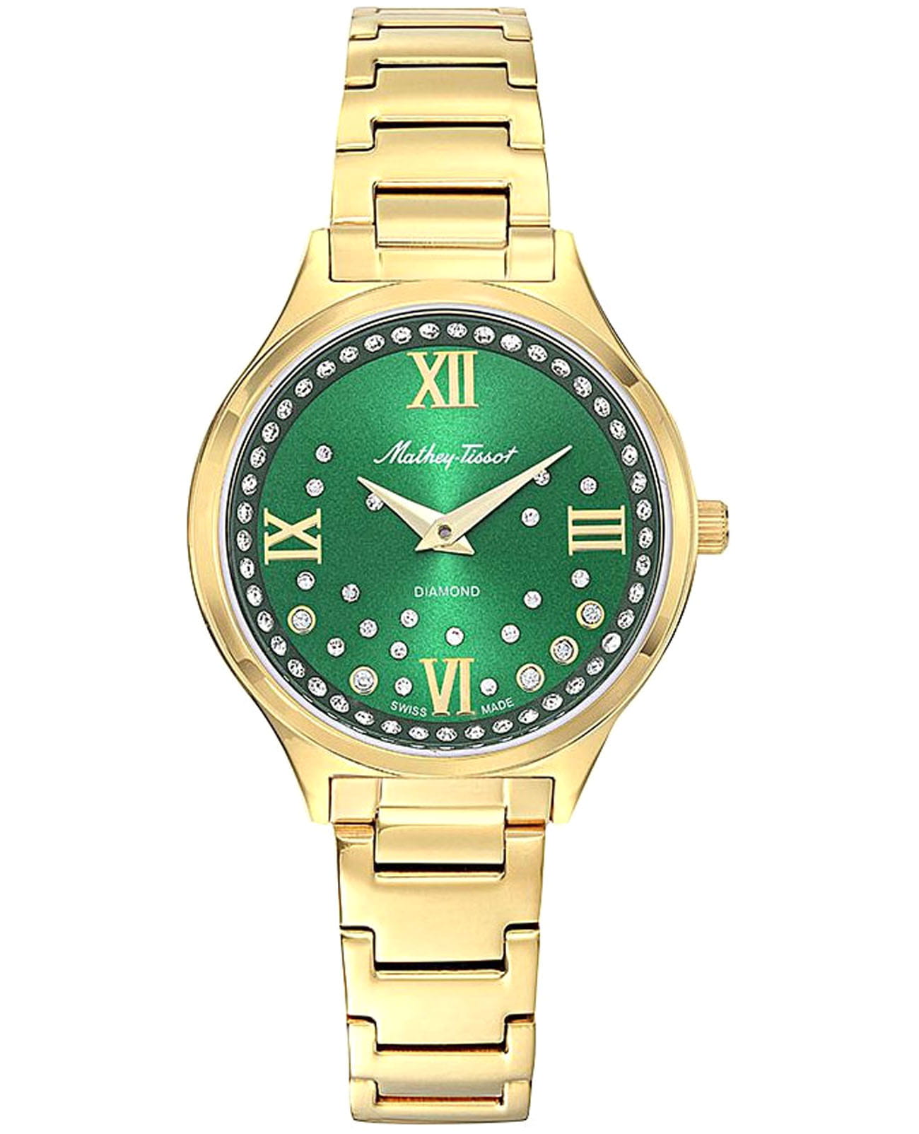 Женские кварцевые часы Mathey-Tissot Nicole D985SPYV — это стильное сочетание элегантности и современного дизайна. Изящный корпус выполнен из нержавеющей стали с PVD-покрытиемPVDУльтратонкое покрытие наносится в технике вакуумного напыления, сочетает в себе нитрид титана особой прочности со слоем золота или оксида хрома. Несёт в себе декоративную или защитную функцию. золотистого цвета, диаметром 32 мм, прекрасно впишется в ваш исключительный стиль. Изысканный циферблат с метками в виде римских цифр придает модели особый блеск и защищен сапфировым стекломСапфировое стеклоПрочный и надёжный материал из кристалла сапфира синтетического происхождения, характеризующийся особой твёрдостью и устойчивостью к царапинам и повреждениям., обеспечивающим устойчивость к царапинам. Циферблат украшен кристаллами. Мечевидные стрелки в стиле Dauphine. Часы оснащены надежным кварцевым механизмом. Рифленая заводная головка. Стальной браслет с PVD-покрытиемPVDУльтратонкое покрытие наносится в технике вакуумного напыления, сочетает в себе нитрид титана особой прочности со слоем золота или оксида хрома. Несёт в себе декоративную или защитную функцию. на застёжке-бабочке с кнопкамиЗастёжка "бабочка"Такой вид застёжки дополняется предохранителями, помогающими избежать случайного раскрытия браслета. Обладают изящным исполнением. гарантирует комфортное и безопасное ношение. Класс водозащиты: 50 метров позволит защитить корпус от случайных брызг или капель дождя. Mathey-Tissot — отличный выбор для тех, кто ценит утонченность и качество.