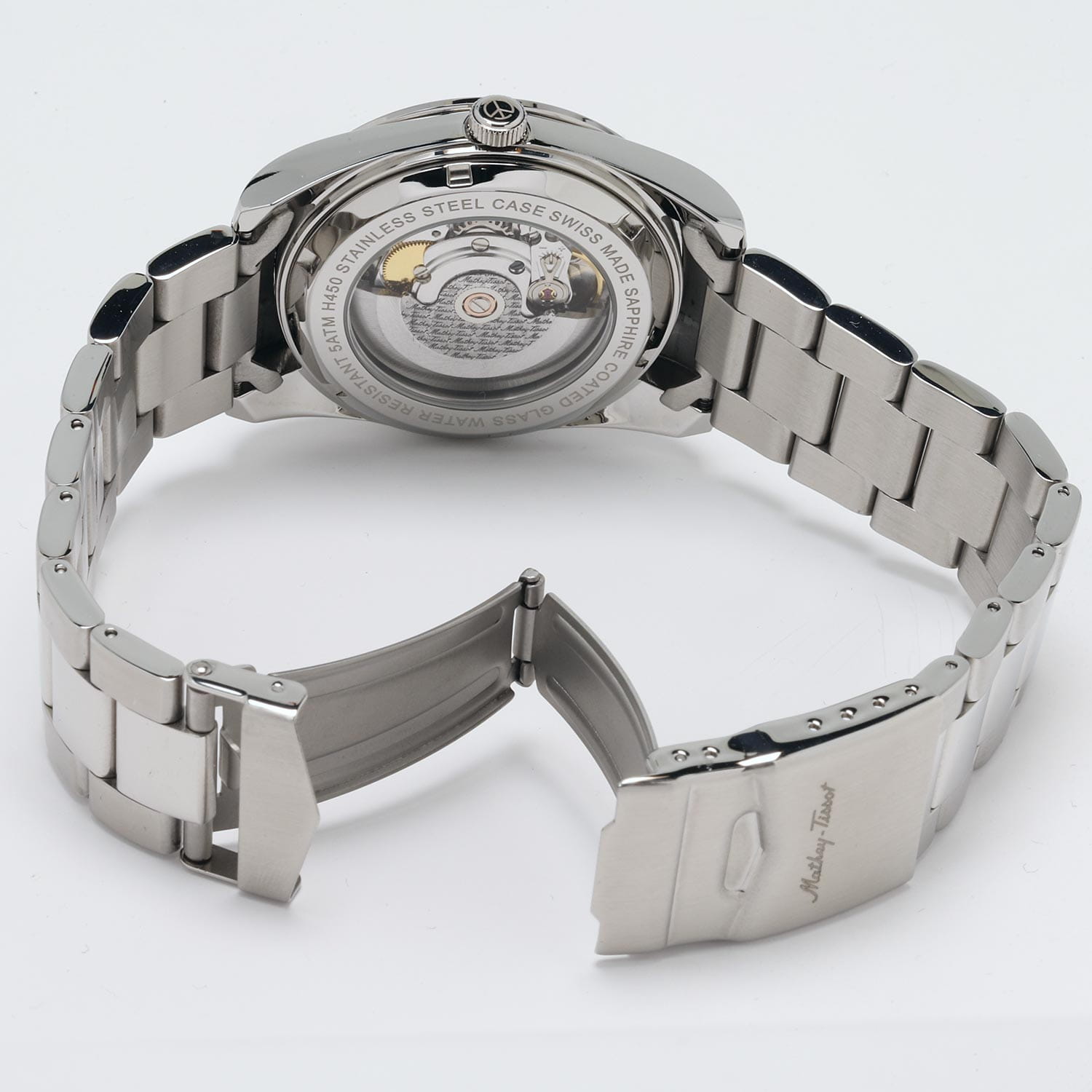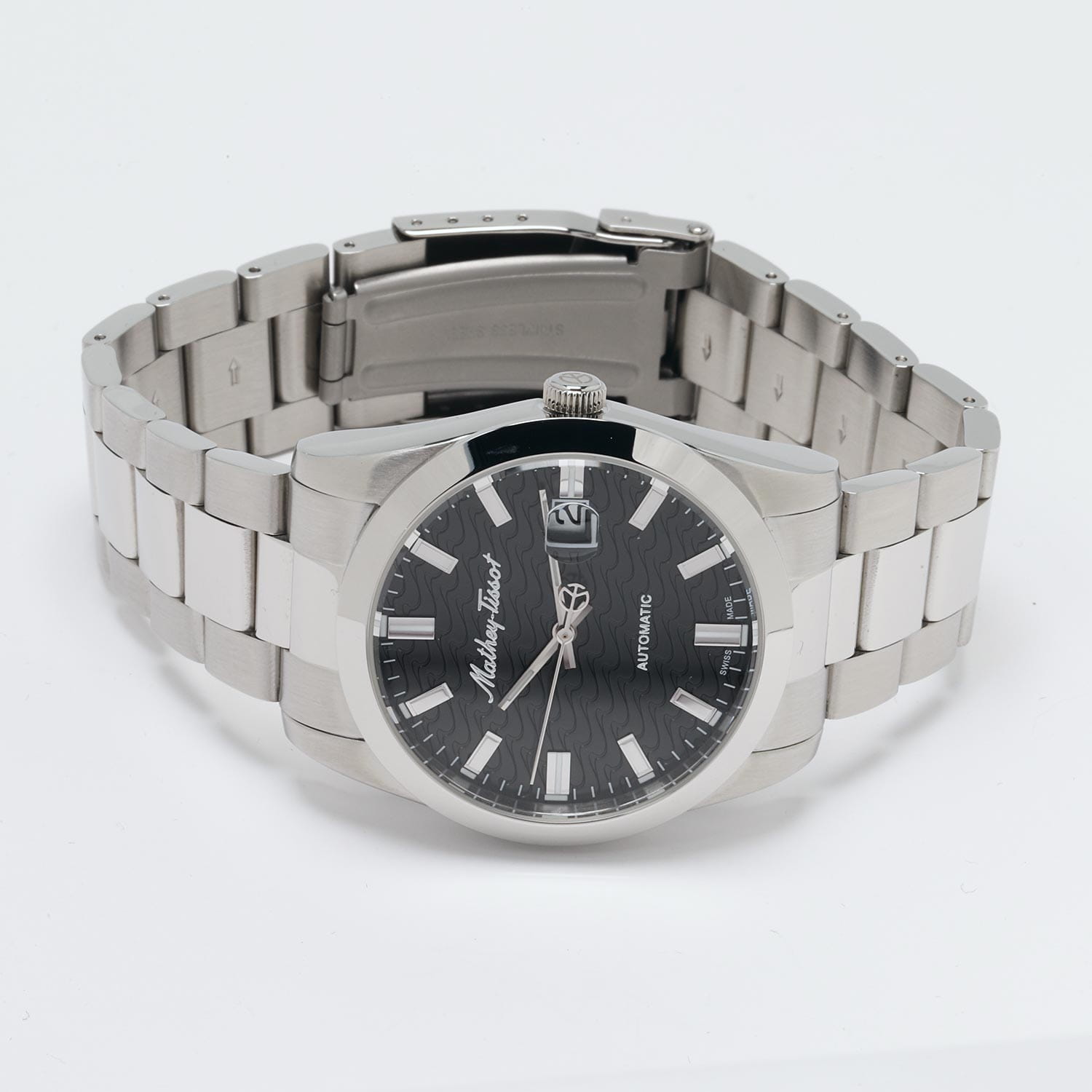 Мужские механические часы с автоподзаводом Mathey-Tissot Mathy H1450ATAN — это стильное сочетание элегантности и современного дизайна. Изящный корпус выполнен из нержавеющей стали, диаметром 42 мм, что придаст образу элегантности и надежности. Изысканный циферблат с метками в виде штрихов придает модели особый блеск. Циферблат защищен минеральным стекломМинеральное стеклоМинеральное стекло представляет собой искусственно выращенный минерал кварца. Такое стекло отличается особой устойчивостью к повреждениям и царапинам. Уступает по некоторым качествам сапфировому стеклу. с сапфировым покрытием, обеспечивает устойчивость к царапинам. Стрелки и метки с люминесцентным покрытиемЛюминесцентное покрытиеПозволяет считывать показания времени в темноте. Производители наносят на стрелки, часовые индексы, безель или поверхность циферблата светонакопительный состав, дающий холодное свечение.. Окошко даты находится в положении 3 часа. Стальной браслет на раскладной застёжке с фиксаторомРаскладная застёжкаТакой тип застёжки используется только на браслетах из металла. Она никогда не раскрывается полностью, происходит разделение на 2 и более частей. Раскладывающая застёжка снизит вероятность потери часов к минимуму., гарантирует комфортное и безопасное ношение. Рифленая заводная головка. Класс водозащиты: 50 метров позволит защитить корпус от случайных брызг или капель дождя. Mathey-Tissot — отличный выбор для тех, кто ценит утонченность и качество.