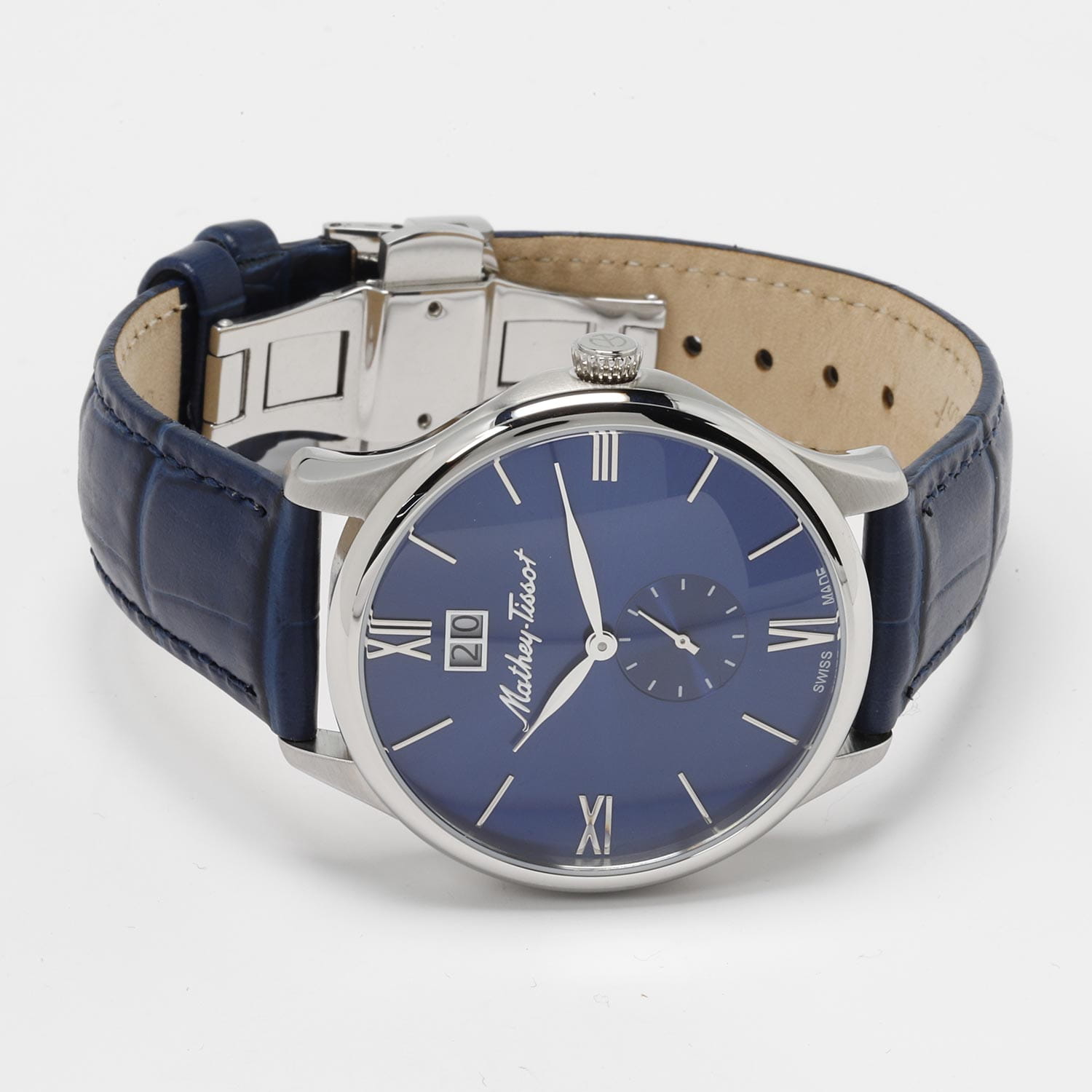 Мужские кварцевые часы Mathey-Tissot Edmond Quartz H1886QABU — это стильное сочетание элегантности и современного дизайна. Изящный корпус выполнен из нержавеющей стали, диаметром 42 мм, что придаст образу элегантности и надежности. Изысканный циферблат с метками в виде штрихов и римских цифр придает модели особый блеск. Циферблат защищен минеральным стекломМинеральное стеклоМинеральное стекло представляет собой искусственно выращенный минерал кварца. Такое стекло отличается особой устойчивостью к повреждениям и царапинам. Уступает по некоторым качествам сапфировому стеклу. с сапфировым покрытием, обеспечивает устойчивость к царапинам. Окошко даты находится в положении 12 часов. Кожаный ремешок с тиснением под кожу аллигатора на застёжке-бабочке с кнопкамиЗастёжка "бабочка"Такой вид застёжки дополняется предохранителями, помогающими избежать случайного раскрытия браслета. Обладают изящным исполнением. , гарантирует комфортное и безопасное ношение. Секундная стрелка вынесена на отдельный циферблат. Рифленая заводная головка. Класс водозащиты: 50 метров позволит защитить корпус от случайных брызг или капель дождя. Mathey-Tissot — отличный выбор для тех, кто ценит утонченность и качество.