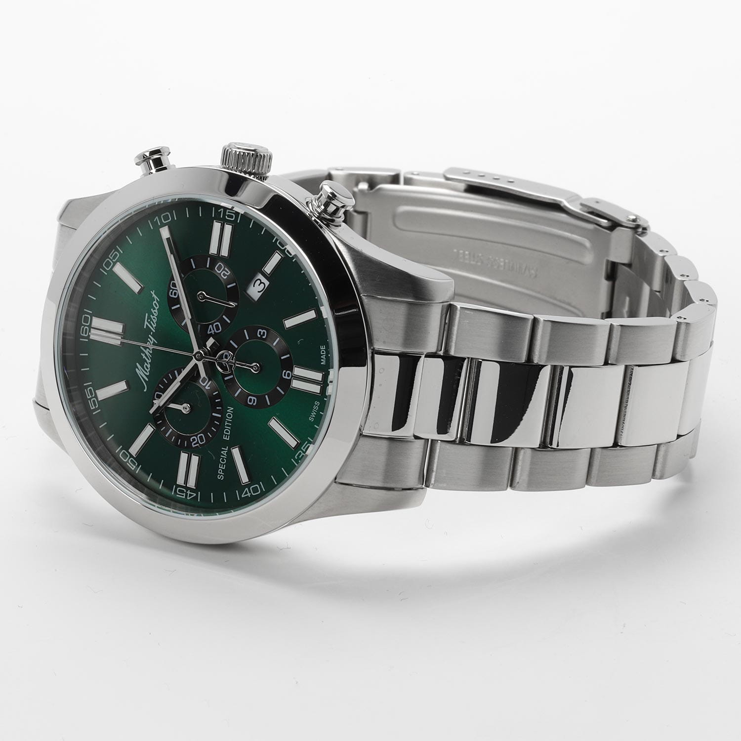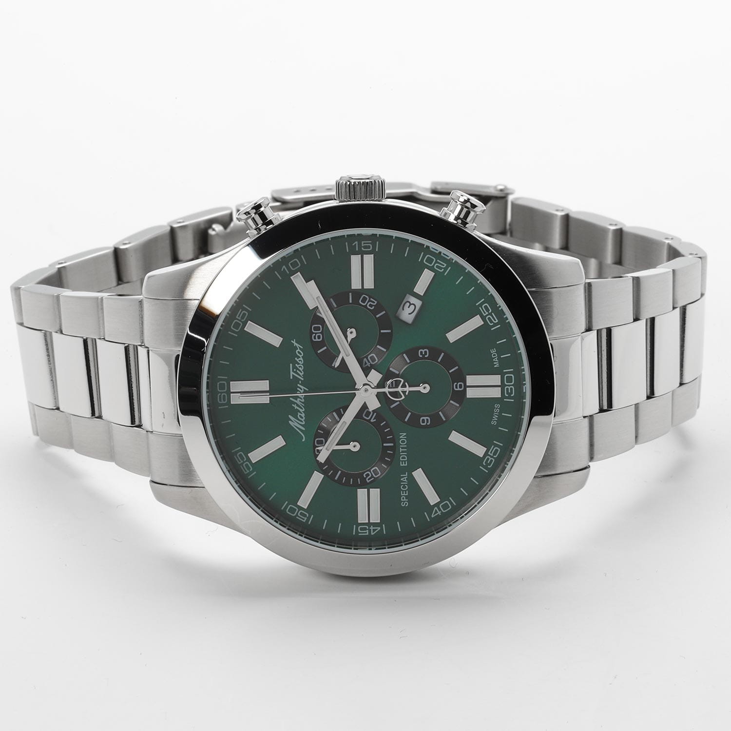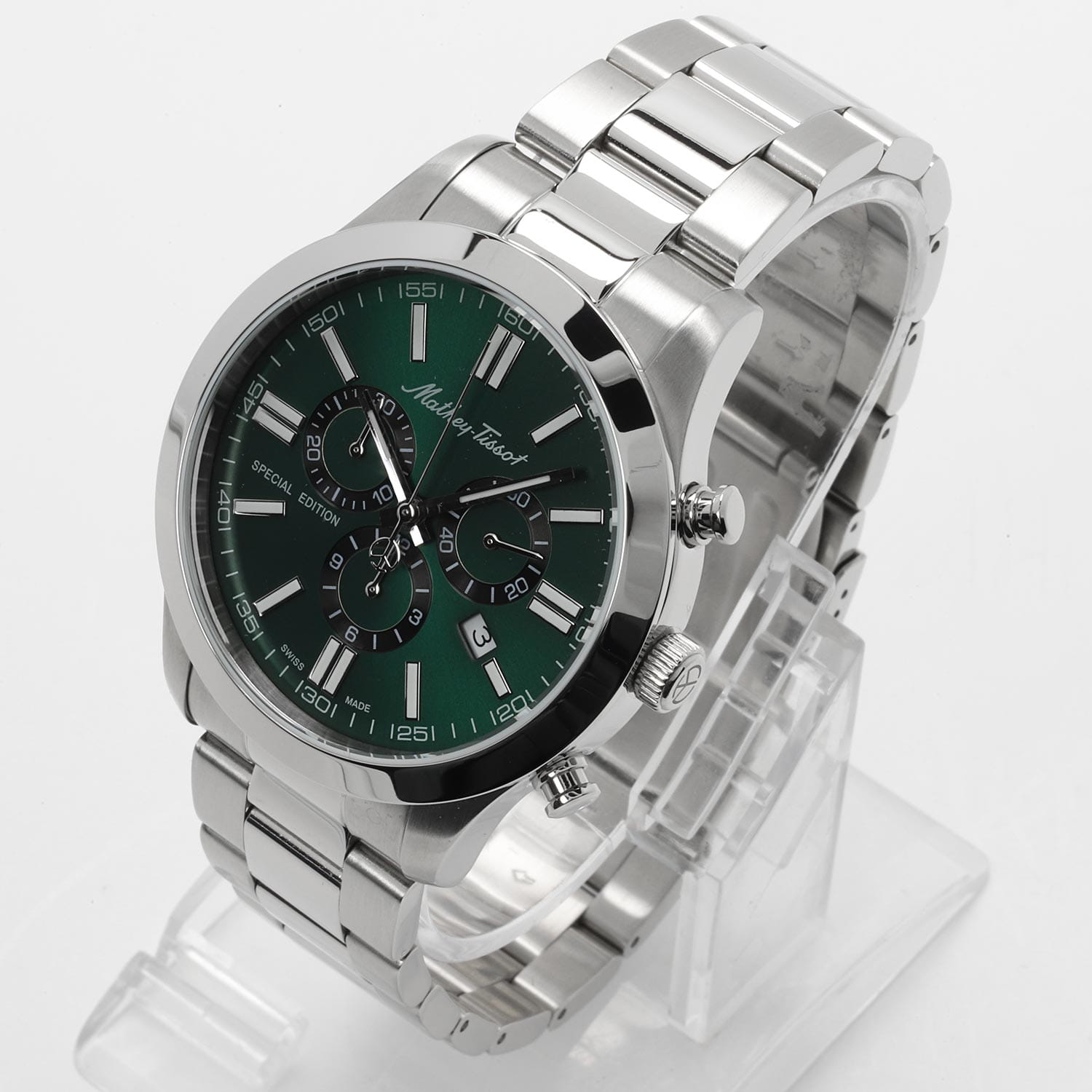 Мужские кварцевые часы-хронографХронографФункция позволяет измерять отрезки времени с особой точностью: часы, минуты, секунды. Верным признаком хронографа является наличие на циферблате 3 дополнительных окошек-счётчиков. с секундомеромСекундомерСекундоме́р — прибор, способный измерять интервалы времени с точностью до долей секунды. Mathey-Tissot Mathy H455CHVE — это стильное сочетание элегантности и современного дизайна. Изящный корпус выполнен из нержавеющей стали, диаметром 44 мм, что придаст образу элегантности и надежности. Изысканный циферблат с метками в виде штрихов придает модели особый блеск. Циферблат защищен минеральным стекломМинеральное стеклоМинеральное стекло представляет собой искусственно выращенный минерал кварца. Такое стекло отличается особой устойчивостью к повреждениям и царапинам. Уступает по некоторым качествам сапфировому стеклу. с сапфировым покрытием, обеспечивает устойчивость к царапинам. Стрелки и метки с люминесцентным покрытиемЛюминесцентное покрытиеПозволяет считывать показания времени в темноте. Производители наносят на стрелки, часовые индексы, безель или поверхность циферблата светонакопительный состав, дающий холодное свечение.. Окошко даты находится в положении 4 часа. Стальной браслет на раскладной застёжке с фиксаторомРаскладная застёжкаТакой тип застёжки используется только на браслетах из металла. Она никогда не раскрывается полностью, происходит разделение на 2 и более частей. Раскладывающая застёжка снизит вероятность потери часов к минимуму., гарантирует комфортное и безопасное ношение. Рифленая заводная головка. Класс водозащиты: 50 метров позволит защитить корпус от случайных брызг или капель дождя. Mathey-Tissot  — отличный выбор для тех, кто ценит утонченность и качество.