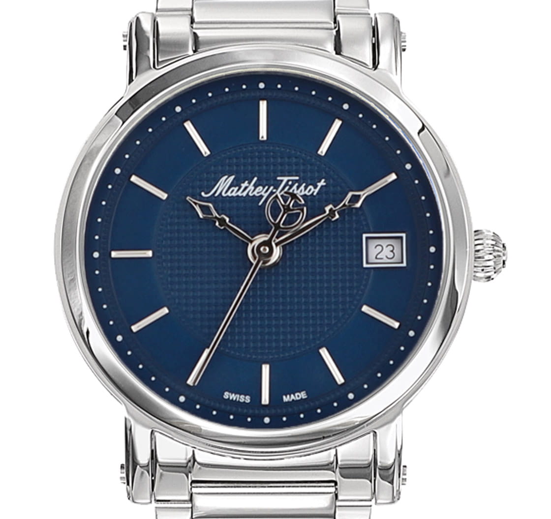 Мужские кварцевые часы Mathey-Tissot City Metal H611251MABU — это стильное сочетание элегантности и современного дизайна. Изящный корпус выполнен из нержавеющей стали 316L серебристого цвета, диаметром 38 мм, что придаст образу элегантности и надежности. Изысканный циферблат с метками в виде штрихов придает модели особый блеск. Циферблат защищен минеральным стекломМинеральное стеклоМинеральное стекло представляет собой искусственно выращенный минерал кварца. Такое стекло отличается особой устойчивостью к повреждениям и царапинам. Уступает по некоторым качествам сапфировому стеклу. с сапфировым покрытием, обеспечивающий устойчивость к царапинам. Окошко даты находится в положении 3 часа. Часы оснащены надежным кварцевым механизмом. Стальной браслет на раскладной застёжкеРаскладная застёжкаТакой тип застёжки используется только на браслетах из металла. Она никогда не раскрывается полностью, происходит разделение на 2 и более частей. Раскладывающая застёжка снизит вероятность потери часов к минимуму., гарантирует комфортное и безопасное ношение. Класс водозащиты: 30 метров позволит защитить корпус от случайных брызг или капель дождя. Mathey-Tissot  — отличный выбор для тех, кто ценит утонченность и качество.