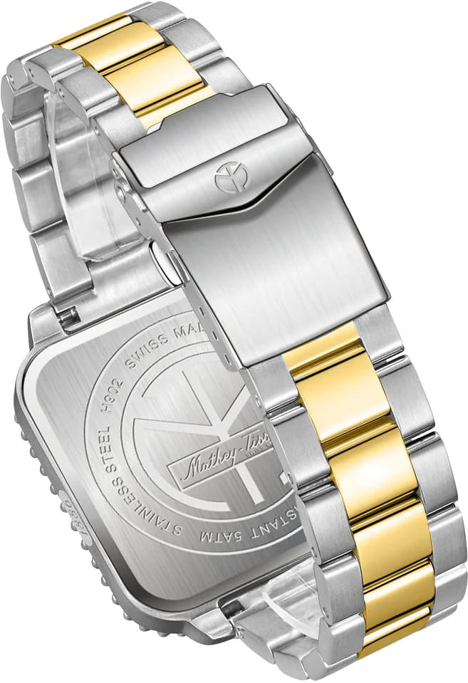 Мужские кварцевые часы Mathey-Tissot Mathy H902QBBU — это стильное сочетание элегантности и современного дизайна. Изящный корпус выполнен из нержавеющей стали, диаметром 42 мм, что придаст образу элегантности и надежности. Изысканный циферблат с метками в виде точек придает модели особый блеск. Циферблат защищен сапфировым стекломСапфировое стеклоПрочный и надёжный материал из кристалла сапфира синтетического происхождения, характеризующийся особой твёрдостью и устойчивостью к царапинам и повреждениям., обеспечивает устойчивость к царапинам. Стрелки и метки с люминесцентным покрытиемЛюминесцентное покрытиеПозволяет считывать показания времени в темноте. Производители наносят на стрелки, часовые индексы, безель или поверхность циферблата светонакопительный состав, дающий холодное свечение. SuperLumiNova, которое светится в темноте после непродолжительной зарядки на свету. БезельБезельВнешний ободок, закрепляющий стекло. В спортивных часах так называется поворотное кольцо с делениями на циферблате, выполняет роль таймера – замеряет отрезки времени на шкале. Неподвижный безель – элемент декора. Однонаправленно вращающийся безель на дайверских часах позволяет фиксировать моменты погружения и выныривания на поверхность. с PVD-покрытиемPVDУльтратонкое покрытие наносится в технике вакуумного напыления, сочетает в себе нитрид титана особой прочности со слоем золота или оксида хрома. Несёт в себе декоративную или защитную функцию. синего цвета. Окошко даты находится в положении 3 часа. Стальной браслет с частичным PVD-покрытиемPVDУльтратонкое покрытие наносится в технике вакуумного напыления, сочетает в себе нитрид титана особой прочности со слоем золота или оксида хрома. Несёт в себе декоративную или защитную функцию. на раскладной застёжке с фиксаторомРаскладная застёжкаТакой тип застёжки используется только на браслетах из металла. Она никогда не раскрывается полностью, происходит разделение на 2 и более частей. Раскладывающая застёжка снизит вероятность потери часов к минимуму., гарантирует комфортное и безопасное ношение. Рифленая заводная головка. Класс водозащиты: 50 метров позволит защитить корпус от случайных брызг или капель дождя. Mathey-Tissot — отличный выбор для тех, кто ценит утонченность и качество.