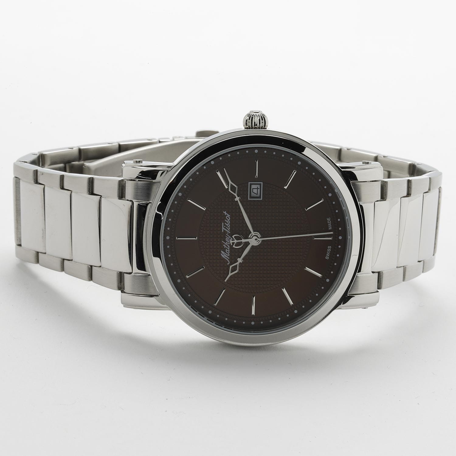 Мужские кварцевые часы Mathey-Tissot City Metal HB611251MAM — это стильное сочетание элегантности и современного дизайна. Изящный корпус выполнен из нержавеющей стали 316L серебристого цвета, диаметром 42 мм, что придаст образу элегантности и надежности. Изысканный циферблат с метками в виде штрихов придает модели особый блеск. Циферблат защищен минеральным стекломМинеральное стеклоМинеральное стекло представляет собой искусственно выращенный минерал кварца. Такое стекло отличается особой устойчивостью к повреждениям и царапинам. Уступает по некоторым качествам сапфировому стеклу. с сапфировым покрытием, обеспечивающий устойчивость к царапинам. Окошко даты находится в положении 3 часа. Часы оснащены надежным кварцевым механизмом. Стальной браслет на раскладной застёжкеРаскладная застёжкаТакой тип застёжки используется только на браслетах из металла. Она никогда не раскрывается полностью, происходит разделение на 2 и более частей. Раскладывающая застёжка снизит вероятность потери часов к минимуму., гарантирует комфортное и безопасное ношение. Класс водозащиты: 30 метров позволит защитить корпус от случайных брызг или капель дождя. Mathey-Tissot — отличный выбор для тех, кто ценит утонченность и качество.