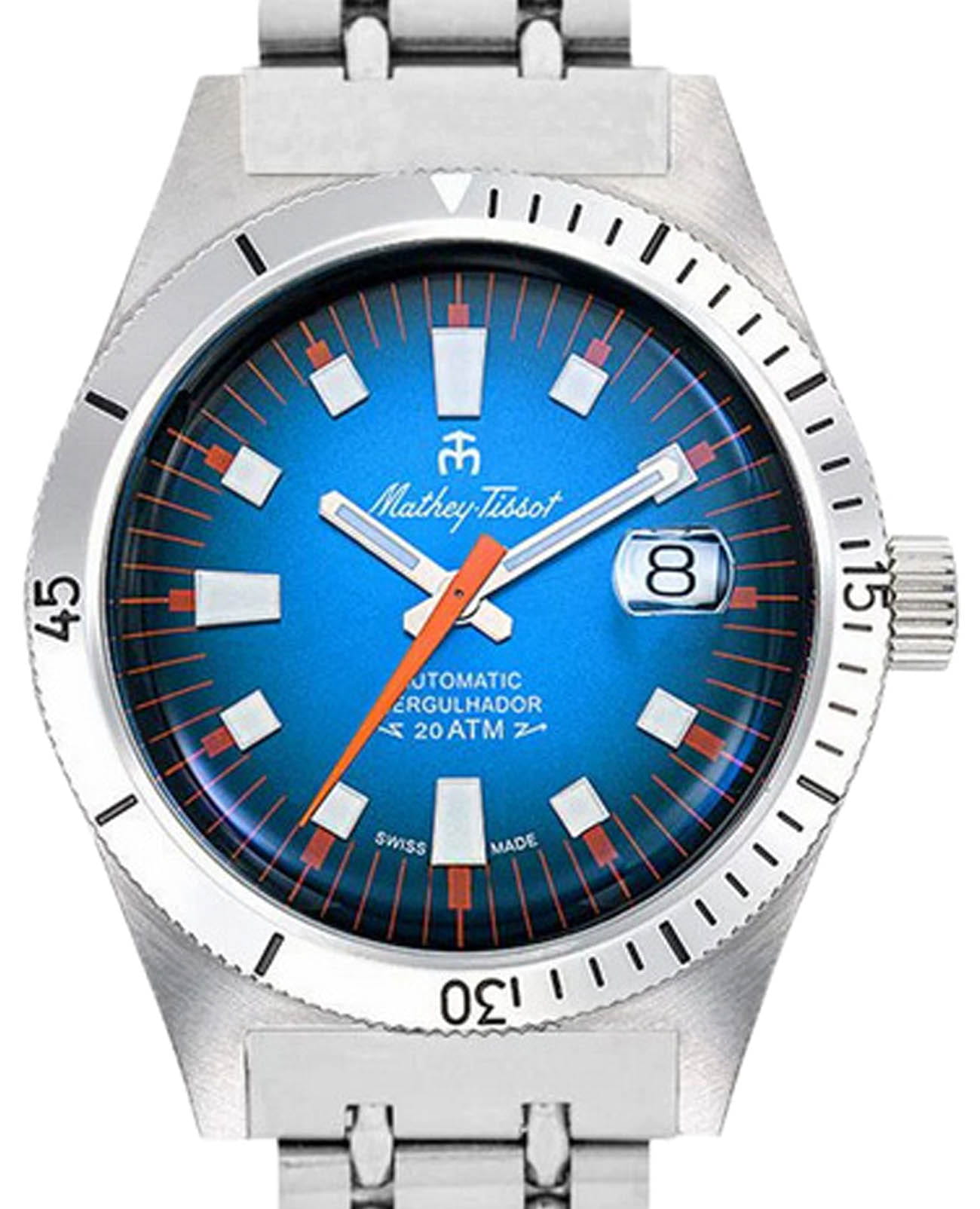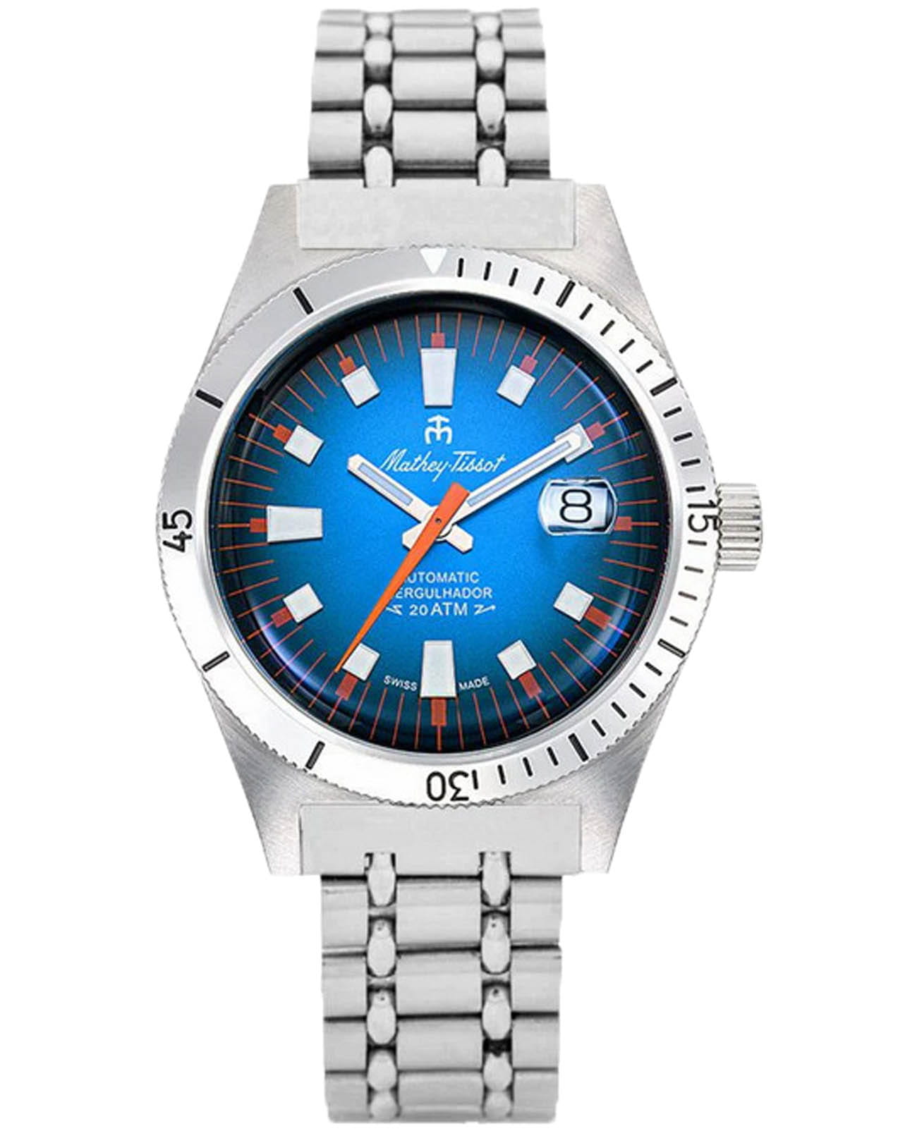 Мужские механические часы с автоподзаводом Mathey-Tissot Mergulhador MRG1 — эти дайверские часы с безупречным дизайном градиентного циферблата идеальны для покорения морских глубин. Изящный корпус выполнен из нержавеющей стали, диаметром 41 мм, что придаст образу элегантности и надежности. Изысканный циферблат с метками в виде штрихов придает модели особый блеск. Циферблат защищен минеральным стекломМинеральное стеклоМинеральное стекло представляет собой искусственно выращенный минерал кварца. Такое стекло отличается особой устойчивостью к повреждениям и царапинам. Уступает по некоторым качествам сапфировому стеклу., обеспечивает устойчивость к царапинам. Окошко даты находится в положении 3 часа. Рифленый вращающийся безельБезельВнешний ободок, закрепляющий стекло. В спортивных часах так называется поворотное кольцо с делениями на циферблате, выполняет роль таймера – замеряет отрезки времени на шкале. Неподвижный безель – элемент декора. Однонаправленно вращающийся безель на дайверских часах позволяет фиксировать моменты погружения и выныривания на поверхность. с минутной шкалой. Прямоугольные стрелки в стиле Baton. Стрелки и метки с люминесцентным покрытиемЛюминесцентное покрытиеПозволяет считывать показания времени в темноте. Производители наносят на стрелки, часовые индексы, безель или поверхность циферблата светонакопительный состав, дающий холодное свечение., которое светится в темноте после непродолжительной зарядки на свету. Стальной браслет на раскладной застёжке с фиксаторомРаскладная застёжкаТакой тип застёжки используется только на браслетах из металла. Она никогда не раскрывается полностью, происходит разделение на 2 и более частей. Раскладывающая застёжка снизит вероятность потери часов к минимуму., гарантирует комфортное и безопасное ношение. Рифленая заводная головка. Класс водозащиты: 200 метров позволит плавать, нырять и заниматься другими водными видами спорта. Mathey-Tissot  — отличный выбор для тех, кто ценит утонченность и качество.