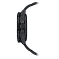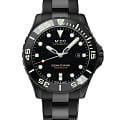 Браслет из нержавеющей стали с чёрным DLC-покрытиемDLC-покрытиеDiamond like carbon - одно из лучших видов покрытия, представляющее собой углерод с алмазными свойствами. На поверхность материала наносятся распавшиеся молекулы углерода, превращающиеся в плёнку из алмазоподобных связей, которая перенимает твёрдость алмаза. и раскладывающейся застёжкойРаскладная застёжкаТакой тип застёжки используется только на браслетах из металла. Она никогда не раскрывается полностью, происходит разделение на 2 и более частей. Раскладывающая застёжка снизит вероятность потери часов к минимуму. с удлинителем для дайвинга обеспечивает комфортное ношение и надёжную фиксацию.