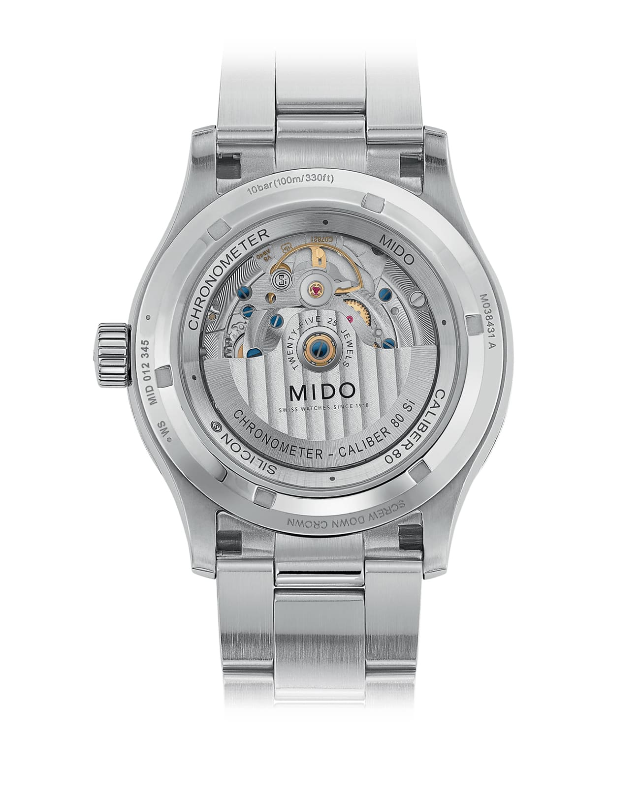 Модель оснащена автоматическим механизмом MIDO Caliber 80 Si с кремниевой пружиной баланса, обеспечивающим запас хода до 80 часов.