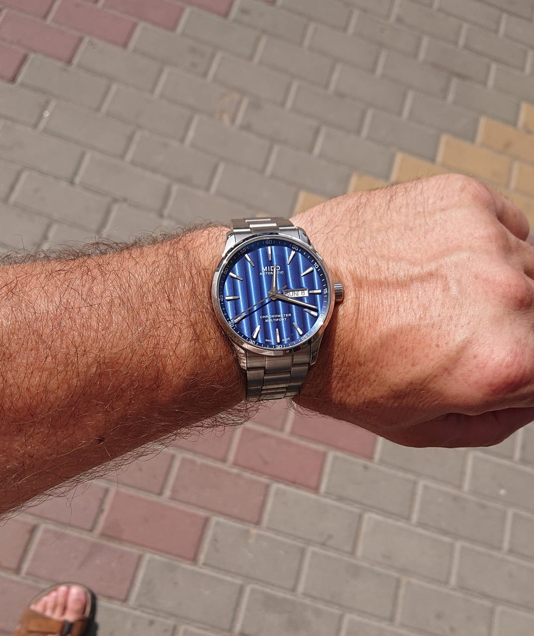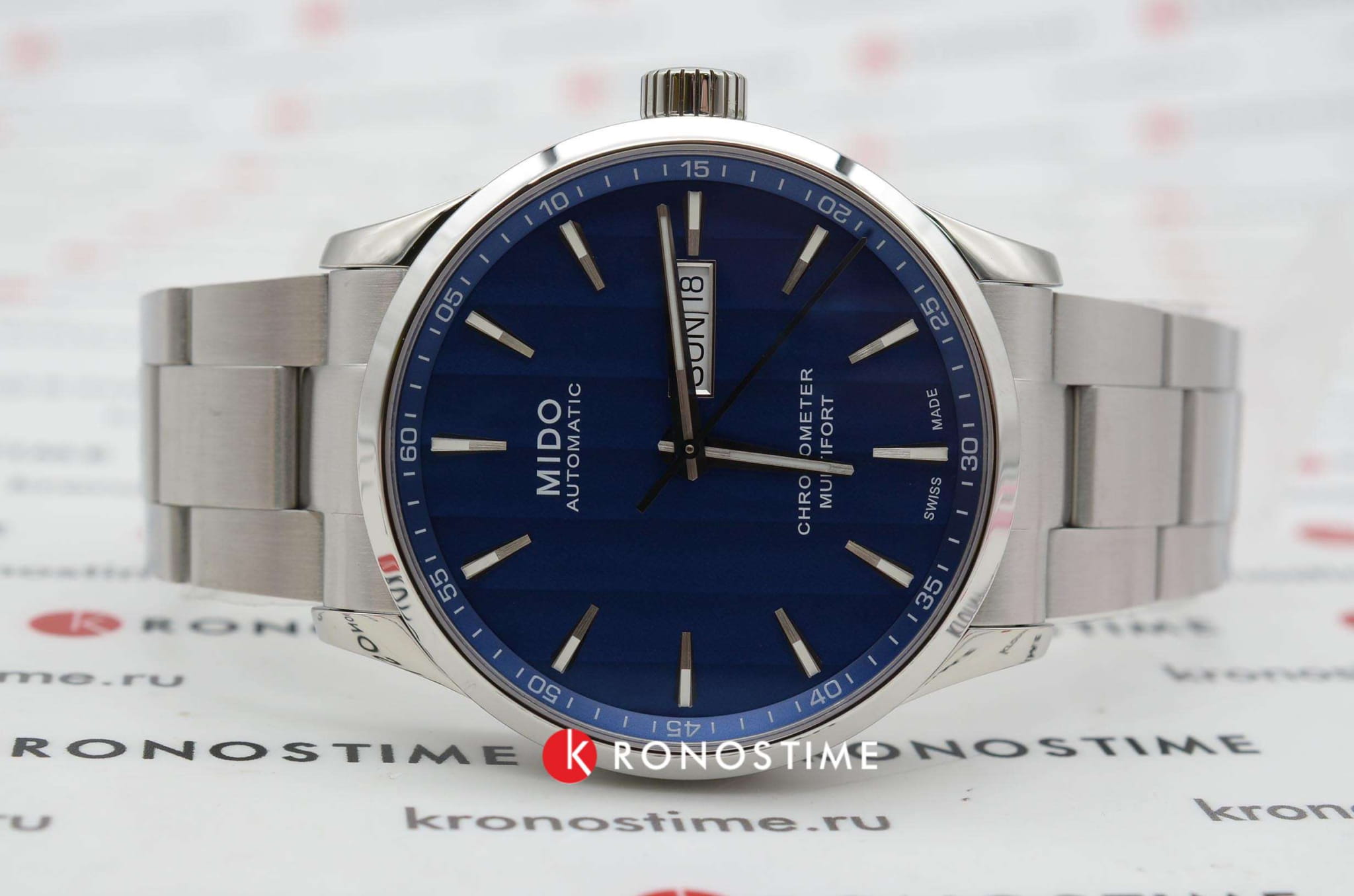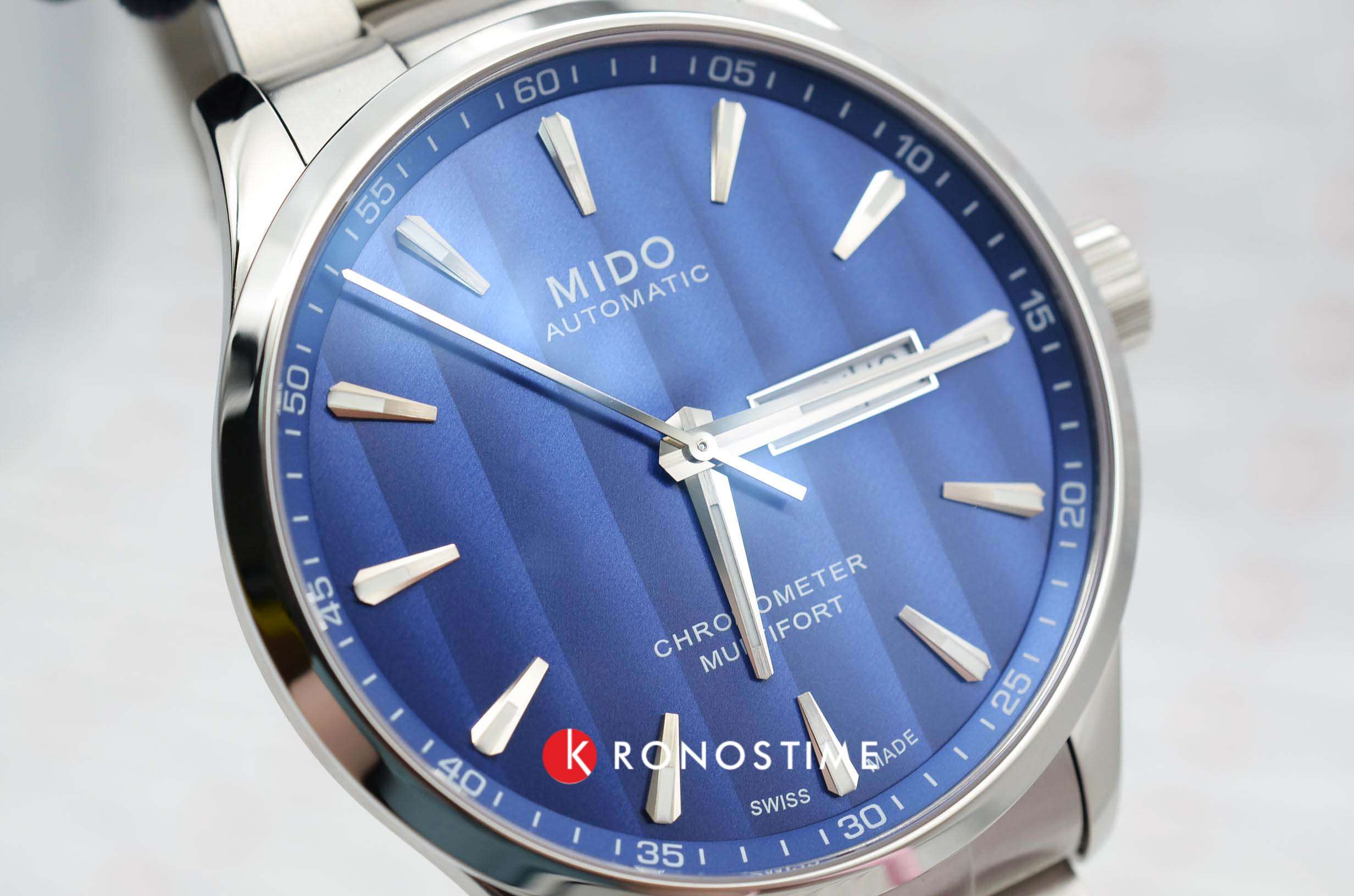 Часы MIDO Multifort Chronometer 1 (артикул M038.431.11.041.00) сочетают элегантный дизайн и высокую точность, сертифицированную COSCСертификат COSCОфициальный сертификат, подтверждающий то, что часы ходят с особо высокой точностью. Для получения документа часы подвергаются тестовым испытаниям, разработанным швейцарским институтом тестирования хронометров COSC. Допустимая норма для механических часов -4/+6 секунд в день, для кварцевых моделей +/- 0,07 секунд в день.. Корпус диаметром 42 мм выполнен из нержавеющей стали с водозащитой до 10 бар (100 метров). Прозрачная задняя крышка подчёркивает изысканный механизм. Синий циферблат с узором «Côtes de Genève» оснащён накладными часовыми метками и стрелками с покрытием Super-LumiNova®Люминесцентное покрытиеПозволяет считывать показания времени в темноте. Производители наносят на стрелки, часовые индексы, безель или поверхность циферблата светонакопительный состав, дающий холодное свечение.. Окошки даты и дня недели расположены в положении «3 часа». Циферблат защищён сапфировым стекломСапфировое стеклоПрочный и надёжный материал из кристалла сапфира синтетического происхождения, характеризующийся особой твёрдостью и устойчивостью к царапинам и повреждениям. с двусторонним антибликовым покрытием.