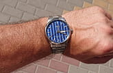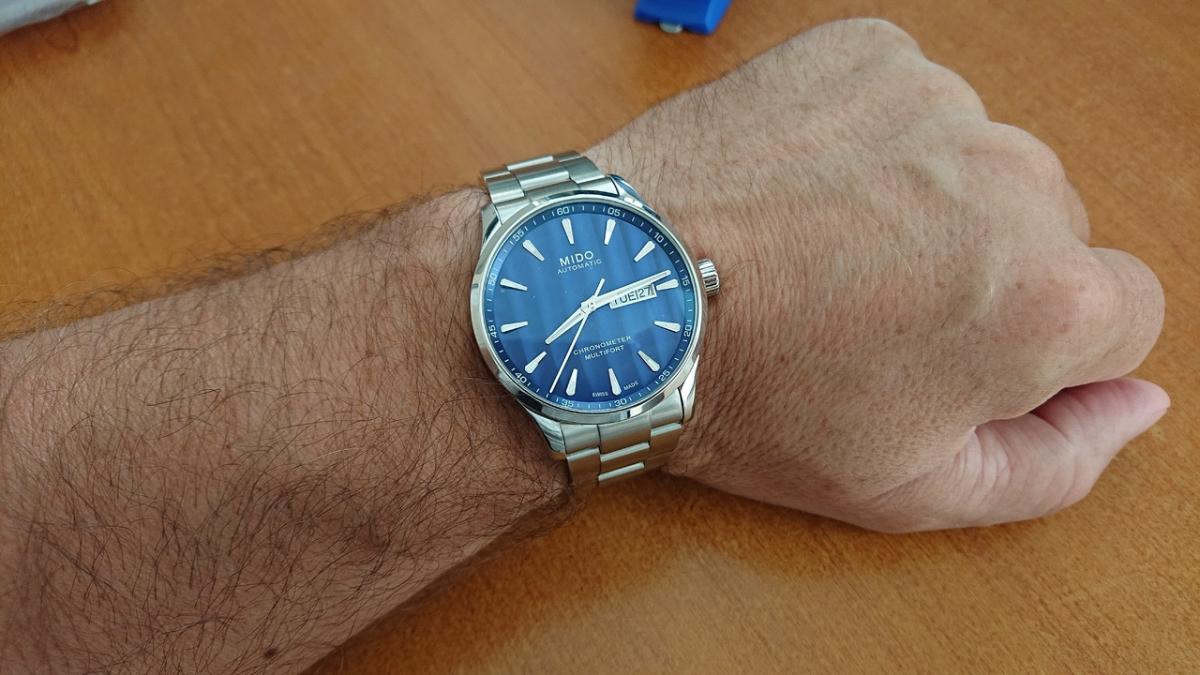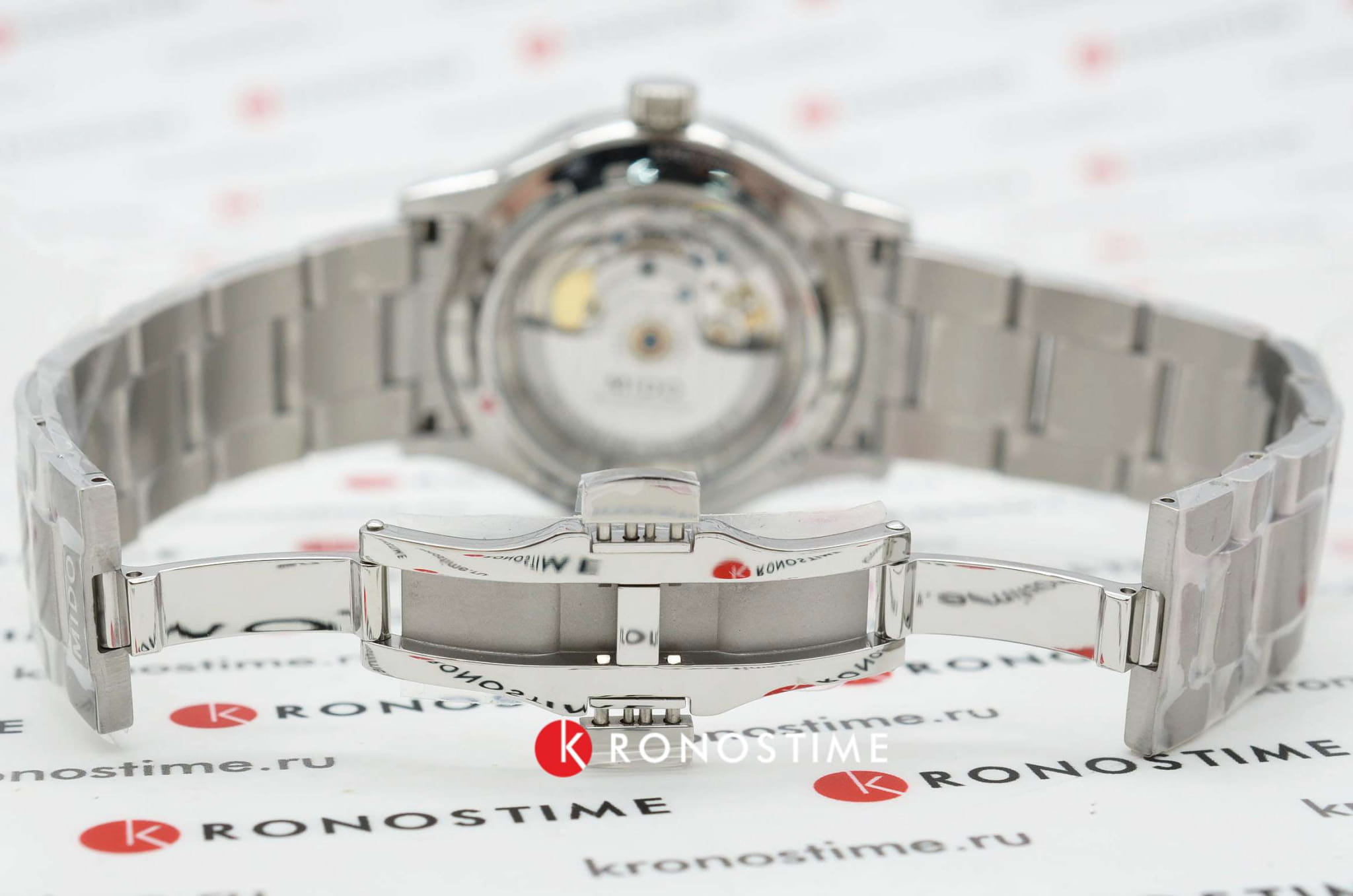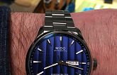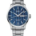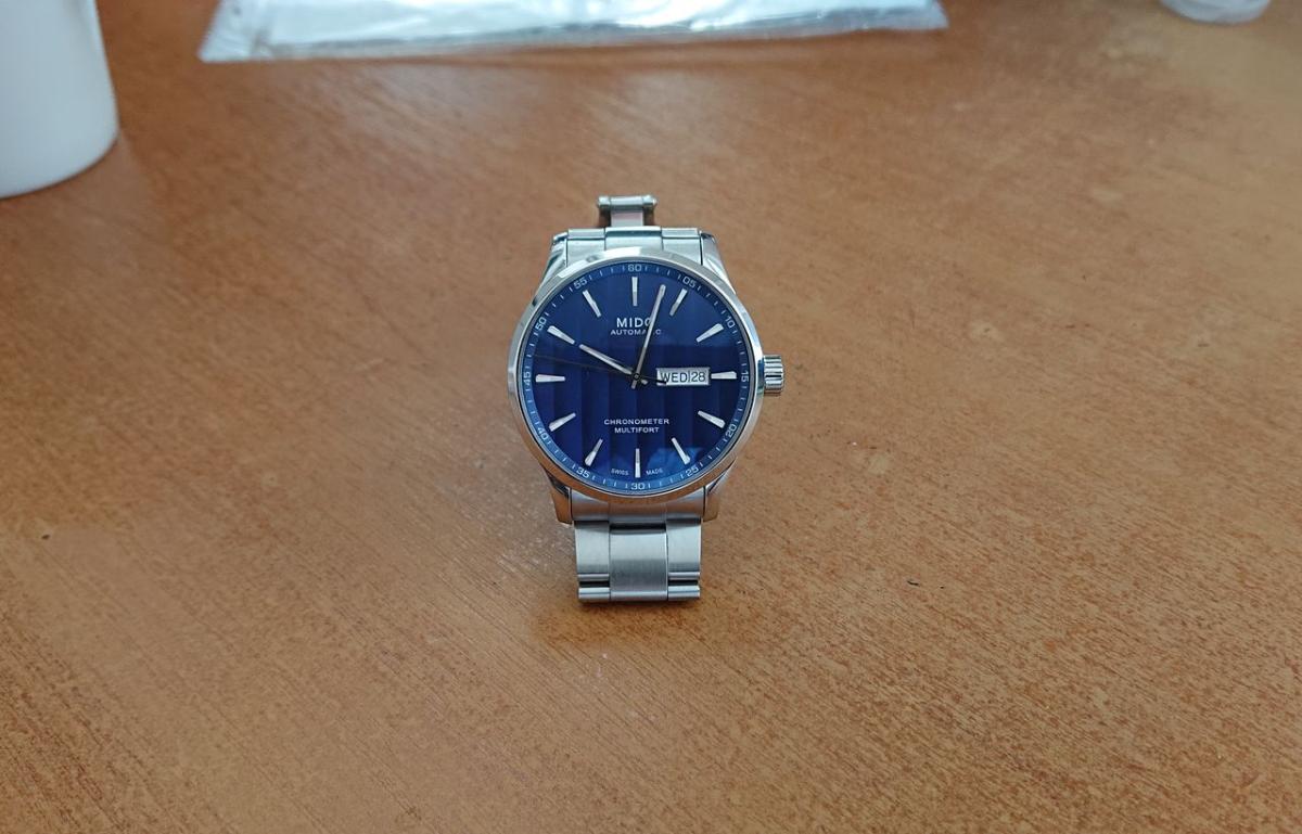 Часы MIDO Multifort Chronometer 1 (артикул M038.431.11.041.00) сочетают элегантный дизайн и высокую точность, сертифицированную COSCСертификат COSCОфициальный сертификат, подтверждающий то, что часы ходят с особо высокой точностью. Для получения документа часы подвергаются тестовым испытаниям, разработанным швейцарским институтом тестирования хронометров COSC. Допустимая норма для механических часов -4/+6 секунд в день, для кварцевых моделей +/- 0,07 секунд в день.. Корпус диаметром 42 мм выполнен из нержавеющей стали с водозащитой до 10 бар (100 метров). Прозрачная задняя крышка подчёркивает изысканный механизм. Синий циферблат с узором «Côtes de Genève» оснащён накладными часовыми метками и стрелками с покрытием Super-LumiNova®Люминесцентное покрытиеПозволяет считывать показания времени в темноте. Производители наносят на стрелки, часовые индексы, безель или поверхность циферблата светонакопительный состав, дающий холодное свечение.. Окошки даты и дня недели расположены в положении «3 часа». Циферблат защищён сапфировым стекломСапфировое стеклоПрочный и надёжный материал из кристалла сапфира синтетического происхождения, характеризующийся особой твёрдостью и устойчивостью к царапинам и повреждениям. с двусторонним антибликовым покрытием.