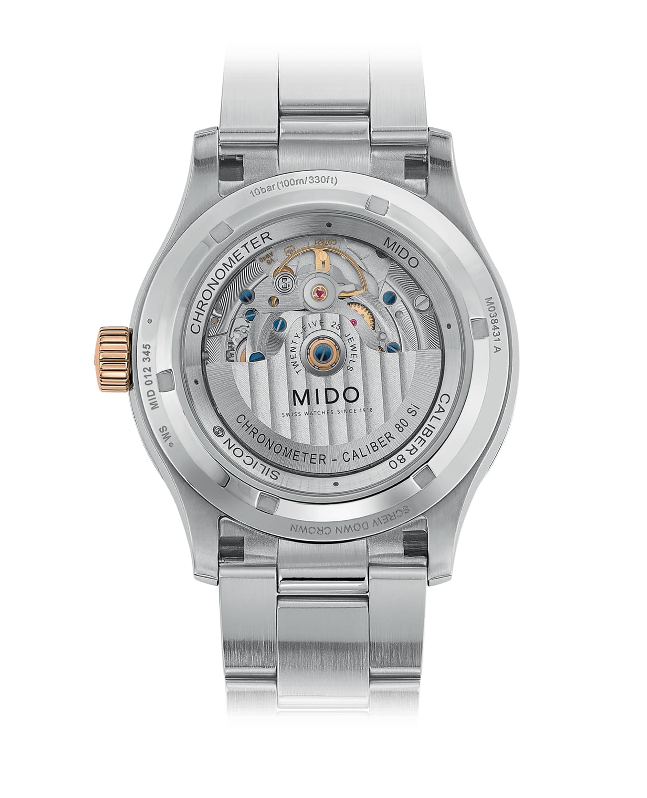 Мужские швейцарские механические часы с хронометром Mido Multifort Chronometer 1 M038.431.21.061.00, механический механизм (автоматический калибр) с высокой точностью. Сапфировое стекло устойчивое к появлению царапин, обладающее высокой прозрачностью. Класс водозащиты: 100 метров, позволит плавать, нырять и заниматься другими водными видами спорта. Корпус часов изготовлен из стали, комбинированного цвета. Невероятно точные и прочные часы украшены характерным для коллекции узором «Женевские полосы». Градуированный безель и часовые метки и стрелки с сатинированной отделкой придают им еще более изысканный вид. Необычную заднюю крышку корпуса дополняет интегрированный фланец с гравировкой.
