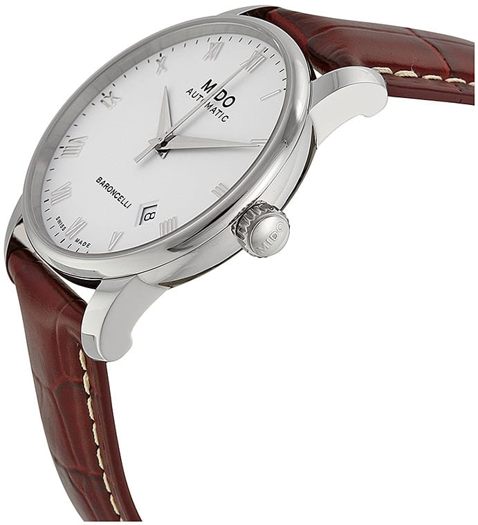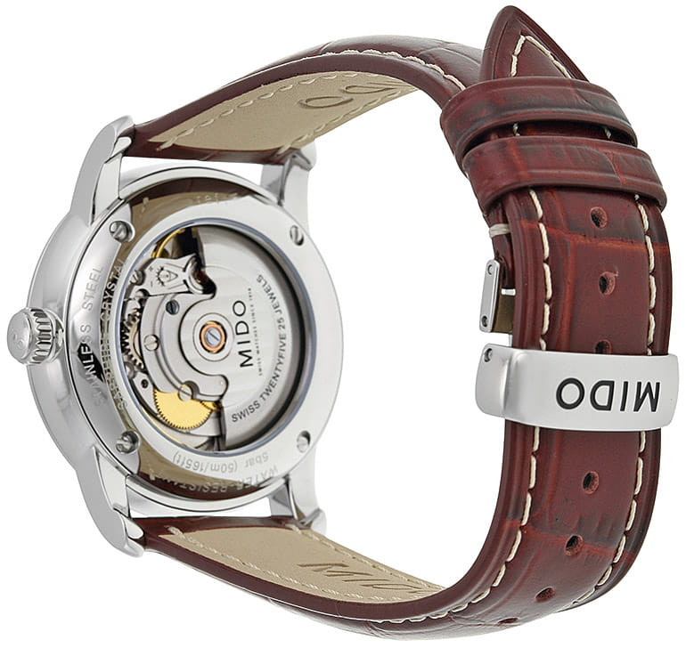 Швейцарские мужские наручные часы Mido Baroncelli M8600.4.26.8, механический механизм (автоматический калибр) с высокой точностью. сапфировое стеклоСапфировое стеклоПрочный и надёжный материал из кристалла сапфира синтетического происхождения, характеризующийся особой твёрдостью и устойчивостью к царапинам и повреждениям. устойчивое к появлению царапин, обладающее высокой прозрачностью. Отображение даты между 4 и 5 часами. Класс водозащиты: 50 метров, позволит защитить корпус от случайных брызг или капель дождя. Корпус часов изготовлен из стали. Кожаный ремешок с раскладной застёжкойРаскладная застёжкаТакой тип застёжки используется только на браслетах из металла. Она никогда не раскрывается полностью, происходит разделение на 2 и более частей. Раскладывающая застёжка снизит вероятность потери часов к минимуму..