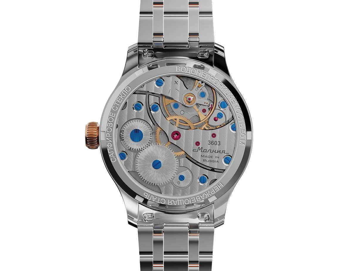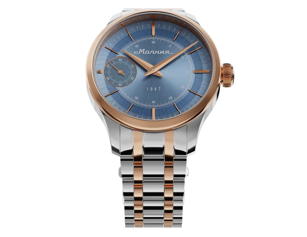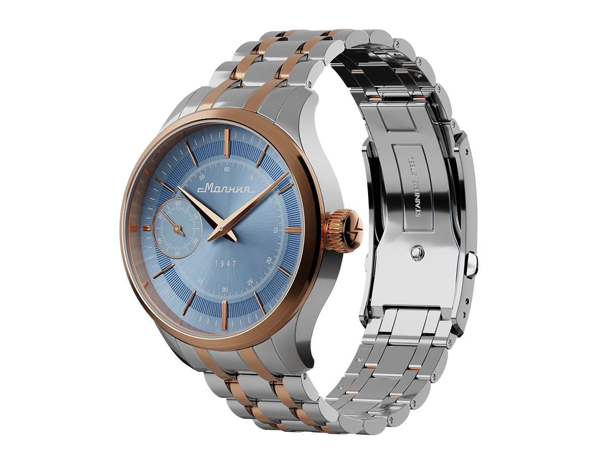 Мужские механические часы с ручным подзаводом — это аксессуар от легендарного бренда «МОЛНИЯ», созданный на Челябинском часовом заводе. Корпус диаметром 41 мм выполнен из нержавеющей стали 316L. БезельБезельВнешний ободок, закрепляющий стекло. В спортивных часах так называется поворотное кольцо с делениями на циферблате, выполняет роль таймера – замеряет отрезки времени на шкале. Неподвижный безель – элемент декора. Однонаправленно вращающийся безель на дайверских часах позволяет фиксировать моменты погружения и выныривания на поверхность. выполнен из стали с PVD-покрытиемPVDУльтратонкое покрытие наносится в технике вакуумного напыления, сочетает в себе нитрид титана особой прочности со слоем золота или оксида хрома. Несёт в себе декоративную или защитную функцию. и зеркальной отделкой. Циферблат голубого цвета оформлен индексами и стрелками. Малая секундная стрелка вынесена на позицию 9 часов. Циферблат защищён сапфировым стекломСапфировое стеклоПрочный и надёжный материал из кристалла сапфира синтетического происхождения, характеризующийся особой твёрдостью и устойчивостью к царапинам и повреждениям. толщиной 2 мм. Механизм — мануфактурный калибр 3603, собранный вручную, с запасом хода до 40 часов. Прозрачная задняя крышка позволяет наблюдать за работой механизма. Часы оснащены стальным браслетом с частичным PVD-покрытиемPVDУльтратонкое покрытие наносится в технике вакуумного напыления, сочетает в себе нитрид титана особой прочности со слоем золота или оксида хрома. Несёт в себе декоративную или защитную функцию. под золото и системой быстрой замены на раскладной застёжкеРаскладная застёжкаТакой тип застёжки используется только на браслетах из металла. Она никогда не раскрывается полностью, происходит разделение на 2 и более частей. Раскладывающая застёжка снизит вероятность потери часов к минимуму. типа клипса. Водонепроницаемость 50 м позволяет использовать часы в повседневных условиях. Идеальный выбор для тех, кто ценит российское качество и традиции.