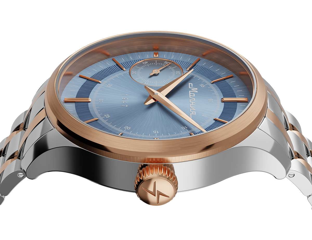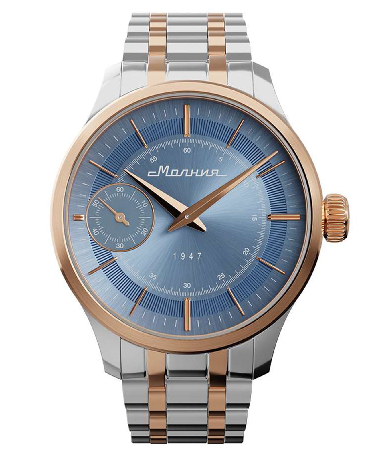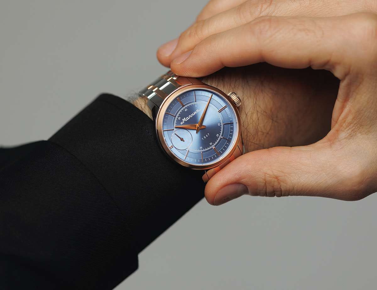 Мужские механические часы с ручным подзаводом — это аксессуар от легендарного бренда «МОЛНИЯ», созданный на Челябинском часовом заводе. Корпус диаметром 41 мм выполнен из нержавеющей стали 316L. БезельБезельВнешний ободок, закрепляющий стекло. В спортивных часах так называется поворотное кольцо с делениями на циферблате, выполняет роль таймера – замеряет отрезки времени на шкале. Неподвижный безель – элемент декора. Однонаправленно вращающийся безель на дайверских часах позволяет фиксировать моменты погружения и выныривания на поверхность. выполнен из стали с PVD-покрытиемPVDУльтратонкое покрытие наносится в технике вакуумного напыления, сочетает в себе нитрид титана особой прочности со слоем золота или оксида хрома. Несёт в себе декоративную или защитную функцию. и зеркальной отделкой. Циферблат голубого цвета оформлен индексами и стрелками. Малая секундная стрелка вынесена на позицию 9 часов. Циферблат защищён сапфировым стекломСапфировое стеклоПрочный и надёжный материал из кристалла сапфира синтетического происхождения, характеризующийся особой твёрдостью и устойчивостью к царапинам и повреждениям. толщиной 2 мм. Механизм — мануфактурный калибр 3603, собранный вручную, с запасом хода до 40 часов. Прозрачная задняя крышка позволяет наблюдать за работой механизма. Часы оснащены стальным браслетом с частичным PVD-покрытиемPVDУльтратонкое покрытие наносится в технике вакуумного напыления, сочетает в себе нитрид титана особой прочности со слоем золота или оксида хрома. Несёт в себе декоративную или защитную функцию. под золото и системой быстрой замены на раскладной застёжкеРаскладная застёжкаТакой тип застёжки используется только на браслетах из металла. Она никогда не раскрывается полностью, происходит разделение на 2 и более частей. Раскладывающая застёжка снизит вероятность потери часов к минимуму. типа клипса. Водонепроницаемость 50 м позволяет использовать часы в повседневных условиях. Идеальный выбор для тех, кто ценит российское качество и традиции.