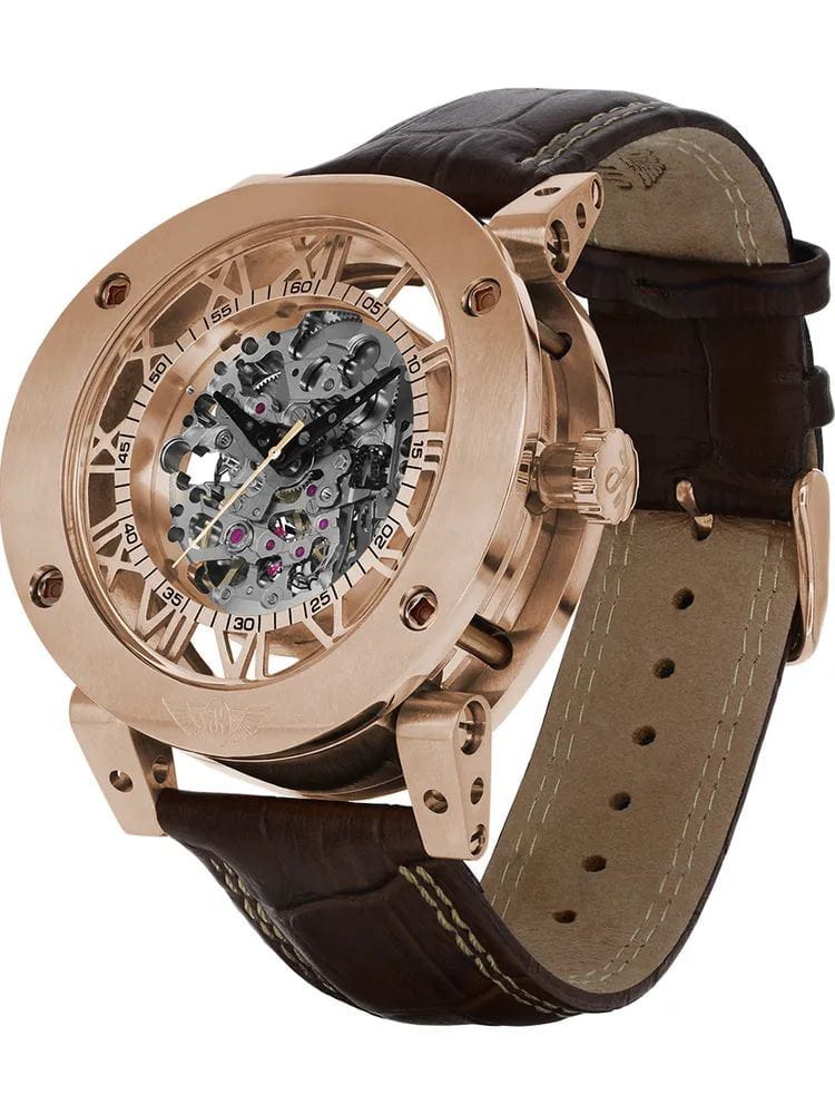 Модель Нестеров H2644F52-13RG — это элегантные мужские часы, сочетающие в себе классический дизайн и надёжность. Корпус диаметром 46 мм выполнен из нержавеющей стали с PVD-покрытиемPVDУльтратонкое покрытие наносится в технике вакуумного напыления, сочетает в себе нитрид титана особой прочности со слоем золота или оксида хрома. Несёт в себе декоративную или защитную функцию. в золотистом цвете, подчёркивая прочность и изысканность конструкции.  Скелетонизированный циферблат с римскими цифрами и стрелками, обеспечивает отличную читаемость в любых условиях.
