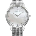 Кварцевые часы. Корпус выполнен из нержавеющей стали. Перламутровый циферблат украшен на месте меток кристаллами Swarovski. Стальной браслет миланского плетения.