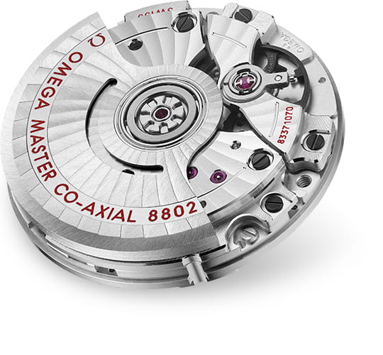 . Часы, представленные на ремешке павлиньего цвета, приводятся в движение коаксиальным хронометром OMEGA 8802, который виден через куполообразное сапфировое стеклоСапфировое стеклоПрочный и надёжный материал из кристалла сапфира синтетического происхождения, характеризующийся особой твёрдостью и устойчивостью к царапинам и повреждениям., устойчивое к царапинам.