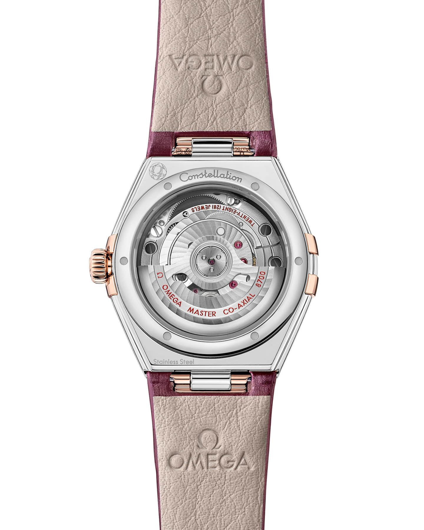 Sedna™, а также бриллиантовые метки в золотых оправах, сверкающие как далекие галактики. Часы облачены в роскошный бордовый кожаный ремешок, переливающийся подобно ночному небу, а их пульсом служит коаксиальный хронометр OMEGA Master Chronometer 8700, чье совершенство раскрывается через кристально чистое сапфировое стеклоСапфировое стеклоПрочный и надёжный материал из кристалла сапфира синтетического происхождения, характеризующийся особой твёрдостью и устойчивостью к царапинам и повреждениям. задней крышки.