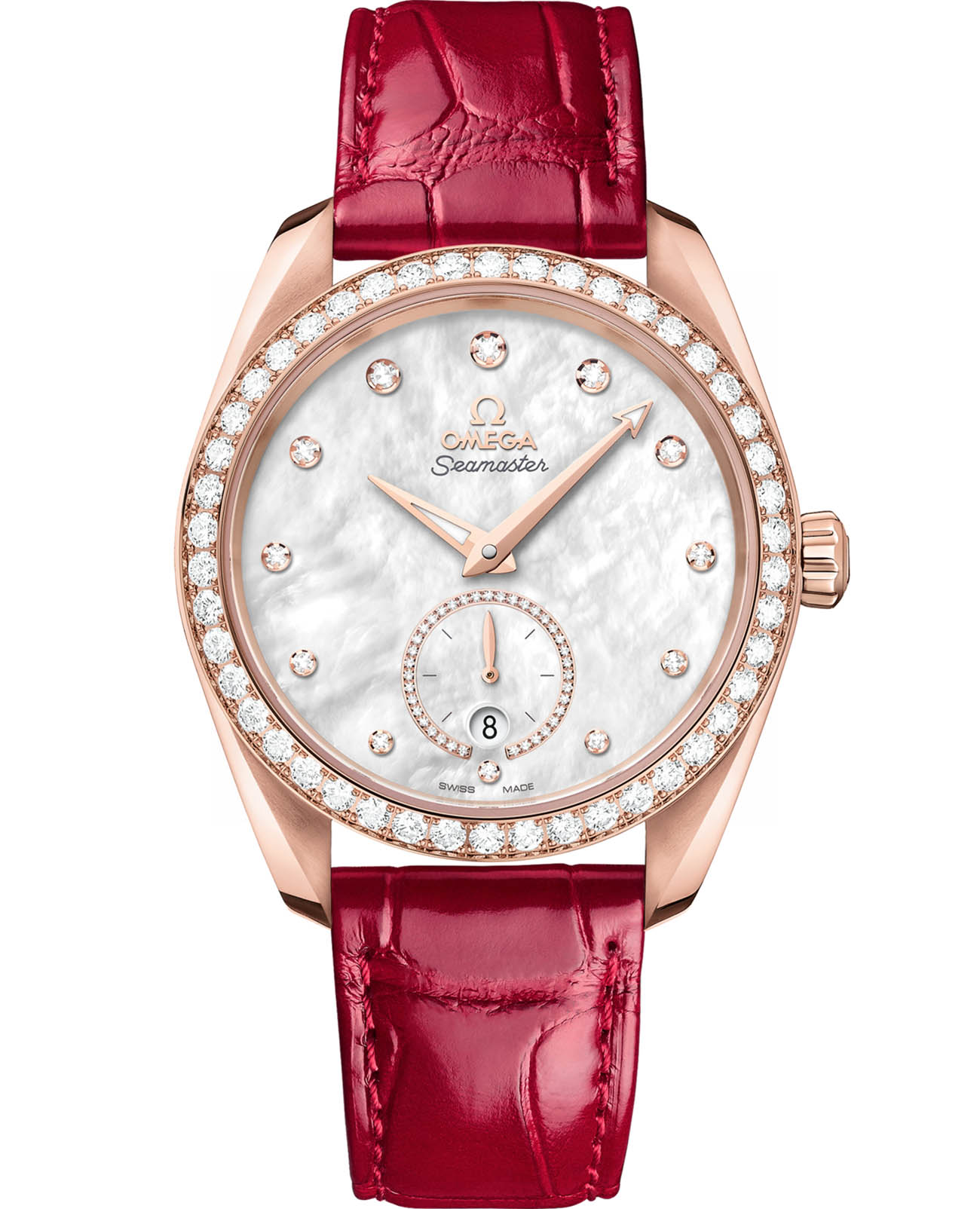 Omega Seamaster Aqua Terra выполнены в симметричном корпусе из 18K Sedna™ золота с волновым узором на задней крышке. Безель украшен бриллиантами, а циферблат дополнен окошком даты на 6 часах и малым секундным циферблатом с кольцом из 18К Sedna™ золота, инкрустированным бриллиантами. Стрелки и метки оснащены люминесцентным покрытиемЛюминесцентное покрытиеПозволяет считывать показания времени в темноте. Производители наносят на стрелки, часовые индексы, безель или поверхность циферблата светонакопительный состав, дающий холодное свечение. для лучшей читаемости в темноте. Индексы выполнены в виде бриллиантов, установленных в держатели из 18К Sedna™ золота. Калибр Omega 8803 сертифицирован как Master Chronometer — гарантия высочайшей точности и устойчивости к магнитным полям. Запас хода составляет 55 часов. Защиту циферблата обеспечивает сапфировое стеклоСапфировое стеклоПрочный и надёжный материал из кристалла сапфира синтетического происхождения, характеризующийся особой твёрдостью и устойчивостью к царапинам и повреждениям. с антибликовым покрытиемАнтибликовое покрытиеСлой оксида металла в 0,13-0,3 микрон, благодаря которому стекло часов не бликует и не отражает свет. Антибликовое покрытие уменьшает отражение света в 10 раз, обеспечивая отличную читаемость показателей циферблата. с обеих сторон. Водозащита позволяет использовать часы в воде без риска повреждения. Диаметр корпуса — 38 мм, между "ушками" — 19 мм, толщина — 12.7 мм. Часы установлены на кожаный ремешок. Вес модели — около 111 грамм. Это сочетание премиального качества, технологичности и классического дизайна.