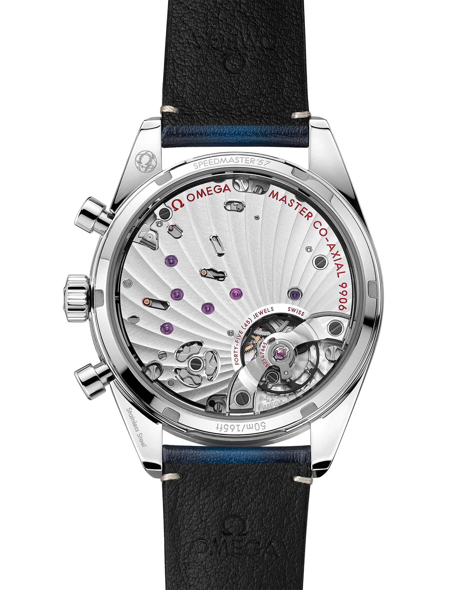 Speedmaster — это не просто часы, а живая легенда OMEGA, прошедшая через все шесть лунных миссий и ставшая олицетворением смелости человеческого духа. 40,5-миллиметровый корпус из нержавеющей стали, вдохновленный легендарным дизайном 1957 года, сочетается с глубоким черным циферблатом, где каждый элемент продуман до мелочей. Углубленные часовые метки, подсвеченные винтажным составом Super-LumiNova, создают неповторимый образ. Стрелки «Broad Arrow» с родиевым покрытием гармонично сочетаются с функциональными элементами: указателем даты на «6 часах», малой секундной стрелкой на «9 часах» и счетчиками хронографаХронографФункция позволяет измерять отрезки времени с особой точностью: часы, минуты, секунды. Верным признаком хронографа является наличие на циферблате 3 дополнительных окошек-счётчиков. на «3 часах». Сатинированный безельБезельВнешний ободок, закрепляющий стекло. В спортивных часах так называется поворотное кольцо с делениями на циферблате, выполняет роль таймера – замеряет отрезки времени на шкале. Неподвижный безель – элемент декора. Однонаправленно вращающийся безель на дайверских часах позволяет фиксировать моменты погружения и выныривания на поверхность. с черненой тахиметрической шкалой придает часам спортивный характер, а плоское сапфировое стеклоСапфировое стеклоПрочный и надёжный материал из кристалла сапфира синтетического происхождения, характеризующийся особой твёрдостью и устойчивостью к царапинам и повреждениям. задней крышки с антибликовым покрытием эффектно демонстрирует гравировку «Speedmaster '57». Внутри бьется сердце этих часов — калибр OMEGA Co-Axial Master Chronometer 9906 с ручным заводом, воплощающий в себе лучшие традиции часового искусства. Завершает образ ремешок из кожи синего цвета с застежкой, украшенной рельефным логотипом OMEGA.