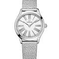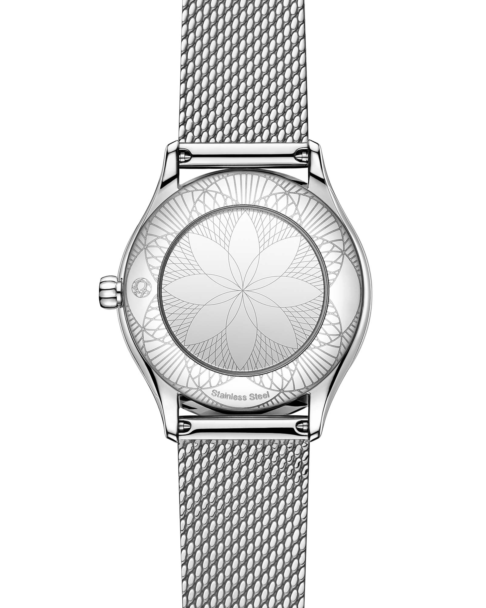 Mini Trésor — воплощение современной женственности OMEGA, где 26-мм корпус из нержавеющей стали играет бриллиантовыми волнами по бокам, а заводная головка с алмазом в обрамлении красной гибридной керамики добавляет дерзкий акцент. Куполообразный циферблат из белой эмали "Grand Feu" с сероватым оттенком и изящными римскими цифрами создает эффект парящей легкости. Плетеный браслет из стали с шелковистым рельефом и раскладывающейся застежкой подчеркивает утонченную прочность, а сапфировое стекло задней крышки с зеркальным эффектом и узором "Her Time" приоткрывает взгляду точный кварцевый механизм OMEGA 4061 — идеальный баланс хрупкости и надежности в миниатюрном шедевре.