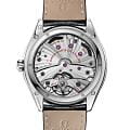 De Ville Trésor — современная интерпретация легендарной коллекции 1949 года, где традиции встречаются с инновациями. 40-мм корпус из нержавеющей стали с бриллиантовым безелемБезельВнешний ободок, закрепляющий стекло. В спортивных часах так называется поворотное кольцо с делениями на циферблате, выполняет роль таймера – замеряет отрезки времени на шкале. Неподвижный безель – элемент декора. Однонаправленно вращающийся безель на дайверских часах позволяет фиксировать моменты погружения и выныривания на поверхность. и черным кожаным ремешком воплощает изысканную простоту. Опалово-серебристый циферблат с волшебным мерцанием украшен стрелками и индексами из белого золота18-каратное золотоОбозначение по каратной системе пробирования, оно показывает, сколько драгоценного металла содержится в изделии. 18 карат - в составе 75% чистого золота, соответствует 750 пробе.