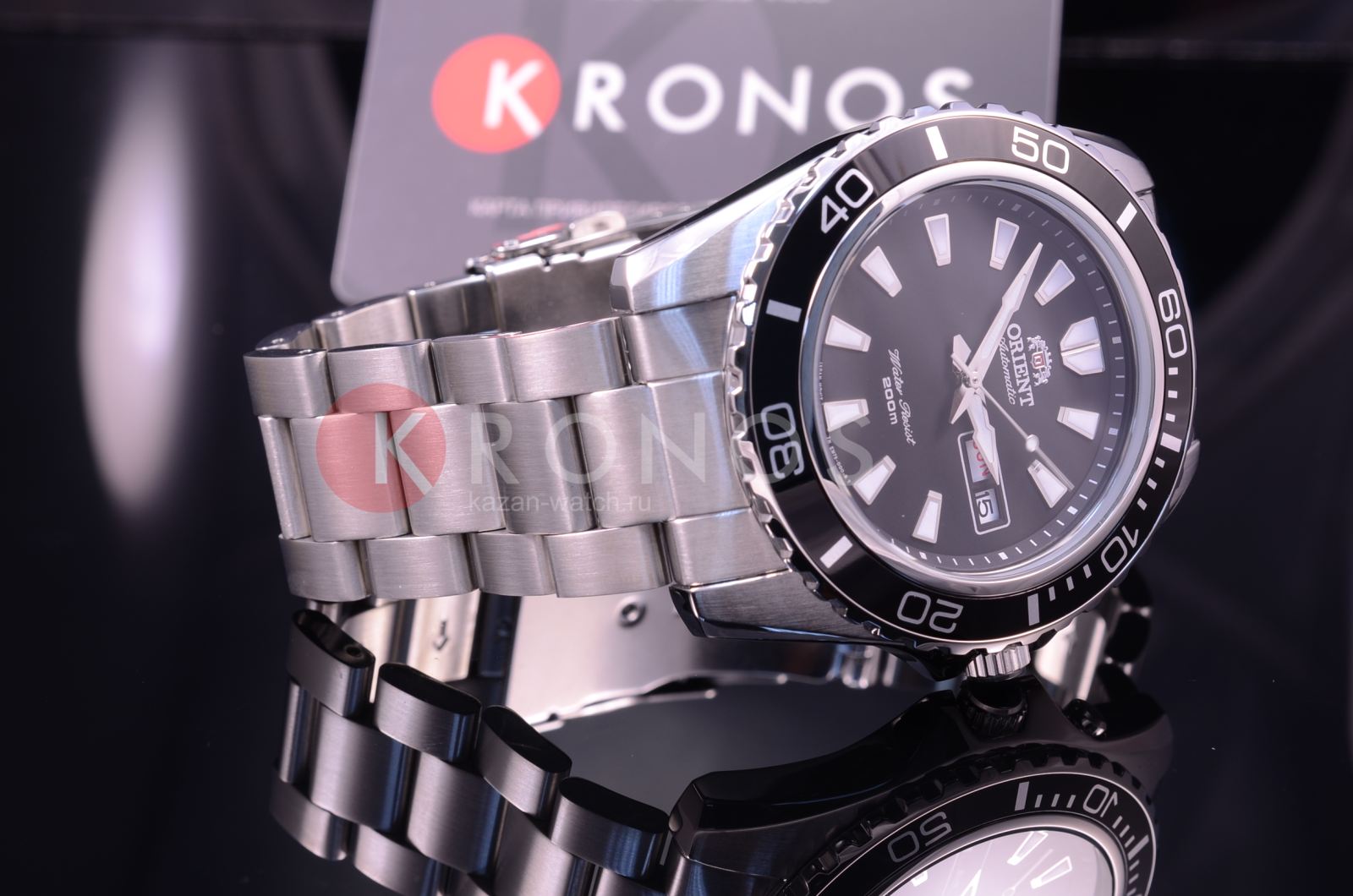 Чёрный циферблат с крупной индикацией времени не имеет лишних деталей. Японский автоматический калибр Orient 46943 имеет запас хода на 40 часов. Завинчивающаяся задняя крышка и заводная головка усиливают водостойкость в 200 метров. люминесцентная подсветкаЛюминесцентное покрытиеПозволяет считывать показания времени в темноте. Производители наносят на стрелки, часовые индексы, безель или поверхность циферблата светонакопительный состав, дающий холодное свечение. позволяет просматривать время и в темноте. На позиции 3 часов – окошко даты и дня недели.