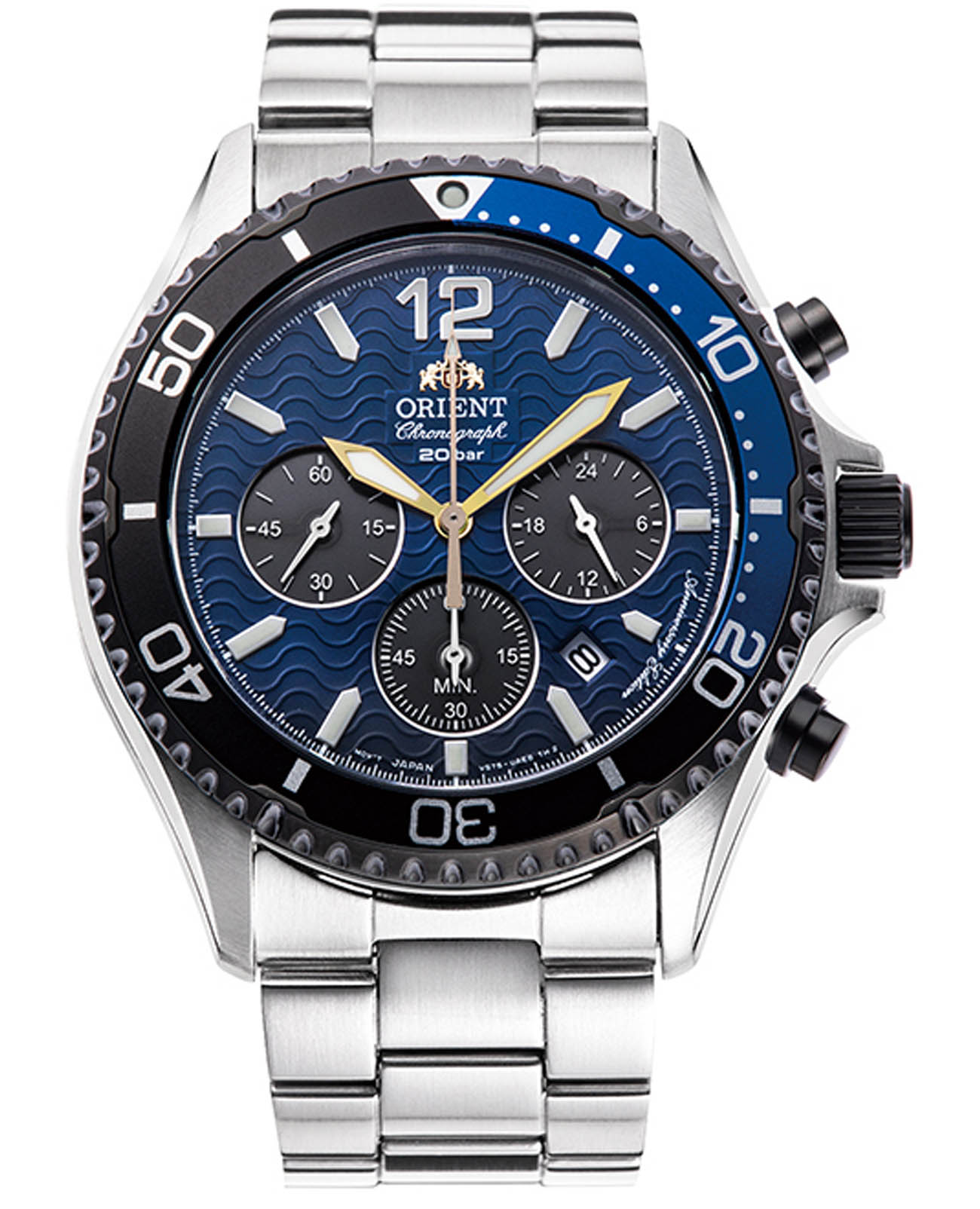 Часы Orient RA-TX0208L — это лимитированная модель, выпущенная в честь 20-летия серии Mako, ограниченная 3 000 экземплярами. Корпус из нержавеющей стали диаметром 42,8 мм оснащён однонаправленным БезелемБезельВнешний ободок, закрепляющий стекло. В спортивных часах так называется поворотное кольцо с делениями на циферблате, выполняет роль таймера – замеряет отрезки времени на шкале. Неподвижный безель – элемент декора. Однонаправленно вращающийся безель на дайверских часах позволяет фиксировать моменты погружения и выныривания на поверхность. чёрно-синего цвета, что подчеркивает их дайверский стиль. Градиентный голубой циферблат с арабской цифрой на отметке «12 часов» и люминесцентными стрелками и меткамиЛюминесцентное покрытиеПозволяет считывать показания времени в темноте. Производители наносят на стрелки, часовые индексы, безель или поверхность циферблата светонакопительный состав, дающий холодное свечение. обеспечивает отличную читаемость в любых условиях. Три субциферблата включают функции хронографа и 24-часового индикатора. Часы оснащены Orient Cal. VS752, который поддерживает запас хода до 6 месяцев при полном заряде. Сапфировое стеклоСапфировое стеклоПрочный и надёжный материал из кристалла сапфира синтетического происхождения, характеризующийся особой твёрдостью и устойчивостью к царапинам и повреждениям. защищает циферблат от царапин, сохраняя идеальный внешний вид. Браслет из нержавеющей стали с раскладной застёжкой обеспечивает комфортное ношение и надёжную фиксацию. Водонепроницаемость до 200 метров делает часы подходящими для плавания и дайвинга. Orient RA-TX0208L — это сочетание исключительного стиля, надёжности и ограниченного выпуска, что делает их идеальным выбором для ценителей часового искусства.