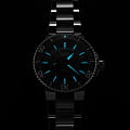 Многокомпонентный корпус из нержавеющей стали, безельБезельВнешний ободок, закрепляющий стекло. В спортивных часах так называется поворотное кольцо с делениями на циферблате, выполняет роль таймера – замеряет отрезки времени на шкале. Неподвижный безель – элемент декора. Однонаправленно вращающийся безель на дайверских часах позволяет фиксировать моменты погружения и выныривания на поверхность. из вольфрама с минутной шкалой. Сапфировое стеклоСапфировое стеклоПрочный и надёжный материал из кристалла сапфира синтетического происхождения, характеризующийся особой твёрдостью и устойчивостью к царапинам и повреждениям., выпуклое с обеих сторон, внутреннее антибликовое покрытие. Стрелки часов с люминесцентным покрытиемЛюминесцентное покрытиеПозволяет считывать показания времени в темноте. Производители наносят на стрелки, часовые индексы, безель или поверхность циферблата светонакопительный состав, дающий холодное свечение.. Запас хода 38 часов.