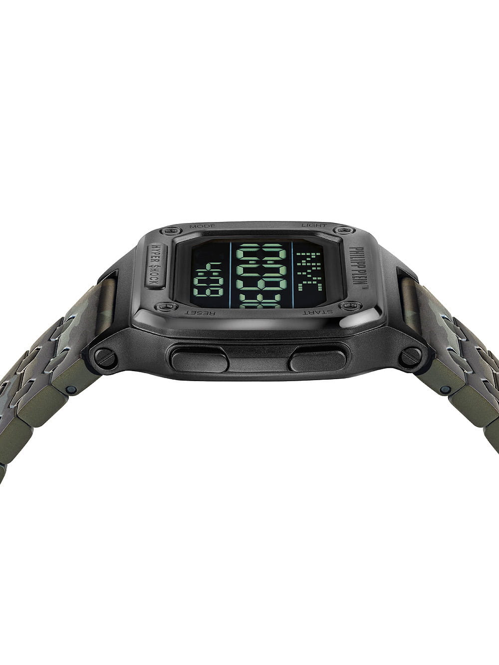 Электронные унисекс часы-хронографХронографФункция позволяет измерять отрезки времени с особой точностью: часы, минуты, секунды. Верным признаком хронографа является наличие на циферблате 3 дополнительных окошек-счётчиков. Philipp Plein Hyper Shock PWHAA0921, электронный механизм с высокой точностью. Класс водозащиты: 50 метров, позволит защитить корпус от случайных брызг или капель дождя. Прямоугольный корпус выполнен из нержавеющей стали с IP-покрытиемIP-покрытиеМетод ионного напыления. Демонстрирует повышенную устойчивость к истиранию, окислению и химическим веществам. Под воздействием высокого давления и температуры около 1500°C молекулы металла надёжно соединяются с частицами корпуса часов. цвета хаки. Браслет из нержавеющей стали шириной 22 мм, застёжка «бабочка» с кнопкамиЗастёжка "бабочка"Такой вид застёжки дополняется предохранителями, помогающими избежать случайного раскрытия браслета. Обладают изящным исполнением. .