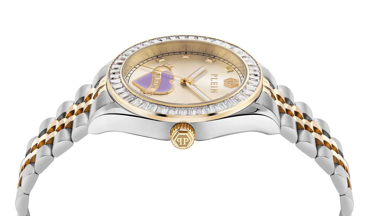 Женские кварцевые часы Philipp Plein Plein Valentine PW2BA0925 – дерзкое заявление любви к роскоши и бунтарскому стилю. Диаметр круглого корпуса из прочной нержавеющей стали равен 38 мм. Минеральное стеклоМинеральное стеклоМинеральное стекло представляет собой искусственно выращенный минерал кварца. Такое стекло отличается особой устойчивостью к повреждениям и царапинам. Уступает по некоторым качествам сапфировому стеклу. защищает циферблат от царапин. БезельБезельВнешний ободок, закрепляющий стекло. В спортивных часах так называется поворотное кольцо с делениями на циферблате, выполняет роль таймера – замеряет отрезки времени на шкале. Неподвижный безель – элемент декора. Однонаправленно вращающийся безель на дайверских часах позволяет фиксировать моменты погружения и выныривания на поверхность. с PVD-покрытиемPVDУльтратонкое покрытие наносится в технике вакуумного напыления, сочетает в себе нитрид титана особой прочности со слоем золота или оксида хрома. Несёт в себе декоративную или защитную функцию. и инкрустирован кристаллами. Стальной браслет на застёжке «бабочка» с кнопкамиЗастёжка "бабочка"Такой вид застёжки дополняется предохранителями, помогающими избежать случайного раскрытия браслета. Обладают изящным исполнением. обеспечивает надёжную фиксацию и комфортное ношение. Люминесцентное покрытиеЛюминесцентное покрытиеПозволяет считывать показания времени в темноте. Производители наносят на стрелки, часовые индексы, безель или поверхность циферблата светонакопительный состав, дающий холодное свечение. стрелок и меток позволит следить за временем даже в полной темноте. Яркий дизайн с узнаваемым логотипом Plein и смелыми акцентами не оставит вас незамеченным. Идеальный аксессуар для тех, кто ценит индивидуальность и не боится выделяться из толпы.