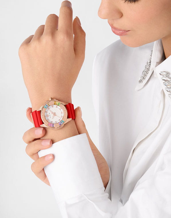 Philipp Plein Plein Majesty PWOFA0325 - дерзкое заявление любви к роскоши и бунтарскому стилю. Диаметр круглого корпуса из прочной нержавеющей стали с PVD-покрытиемPVDУльтратонкое покрытие наносится в технике вакуумного напыления, сочетает в себе нитрид титана особой прочности со слоем золота или оксида хрома. Несёт в себе декоративную или защитную функцию. равен 38 мм. Силиконовый ремешок на стандартной застёжке обеспечивает надёжную фиксацию и комфортное ношение. Метки в виде кристаллов Preciosa. Минеральное стеклоМинеральное стеклоМинеральное стекло представляет собой искусственно выращенный минерал кварца. Такое стекло отличается особой устойчивостью к повреждениям и царапинам. Уступает по некоторым качествам сапфировому стеклу. защищает циферблат от царапин. Люминесцентное покрытиеЛюминесцентное покрытиеПозволяет считывать показания времени в темноте. Производители наносят на стрелки, часовые индексы, безель или поверхность циферблата светонакопительный состав, дающий холодное свечение. стрелок и меток позволит следить за временем даже в полной темноте. БезельБезельВнешний ободок, закрепляющий стекло. В спортивных часах так называется поворотное кольцо с делениями на циферблате, выполняет роль таймера – замеряет отрезки времени на шкале. Неподвижный безель – элемент декора. Однонаправленно вращающийся безель на дайверских часах позволяет фиксировать моменты погружения и выныривания на поверхность. инкрустирован кристаллами. Влагозащита: 50 метров, позволит защитить корпус от случайных брызг или капель дождя. Идеальный аксессуар для тех, кто ценит индивидуальность и не боится выделяться из толпы.