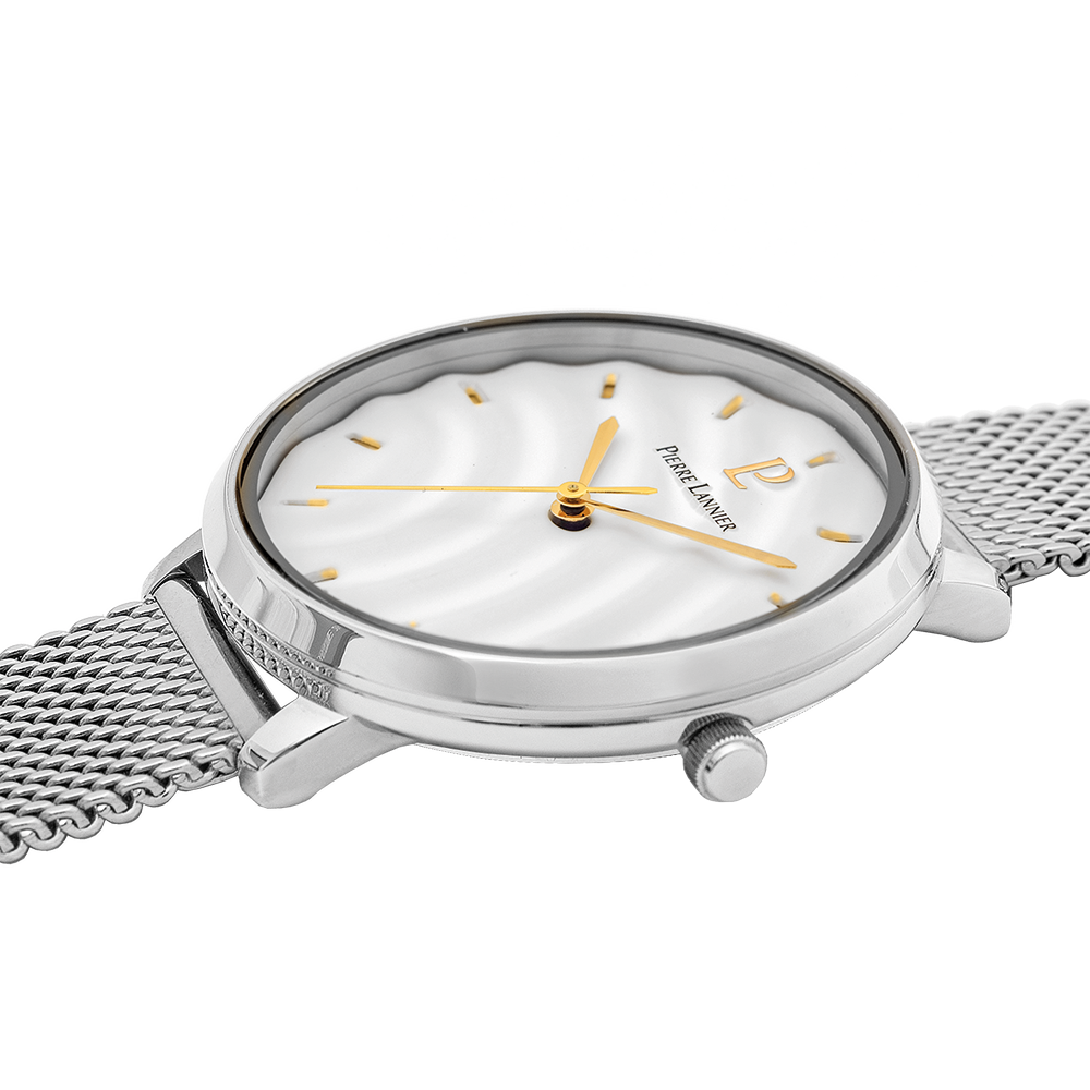 Женские кварцевые часы Pierre Lannier Betty Blanc 064L601. Центральные часовая,минутная и секундная стрелки. Круглый корпус выполнен из полированной нержавеющей стали. Стальной браслет на раскладная застёжкаРаскладная застёжкаТакой тип застёжки используется только на браслетах из металла. Она никогда не раскрывается полностью, происходит разделение на 2 и более частей. Раскладывающая застёжка снизит вероятность потери часов к минимуму.. Фасетчатое минеральное стеклоМинеральное стеклоМинеральное стекло представляет собой искусственно выращенный минерал кварца. Такое стекло отличается особой устойчивостью к повреждениям и царапинам. Уступает по некоторым качествам сапфировому стеклу., устойчивое к мелким механическим повреждениям. Водостойкость:30 метров, позволит защитить корпус от случайных брызг или капель дождя.