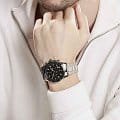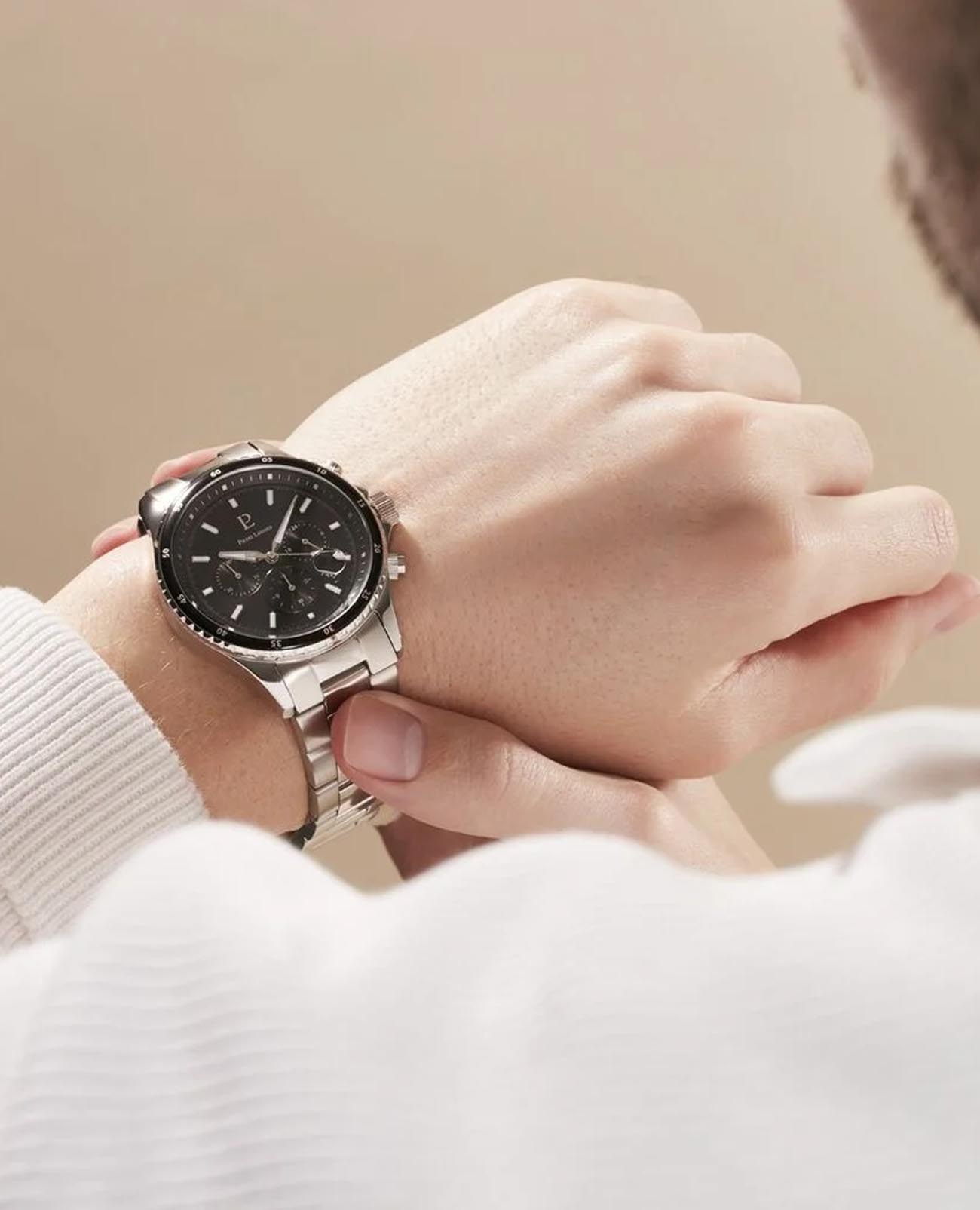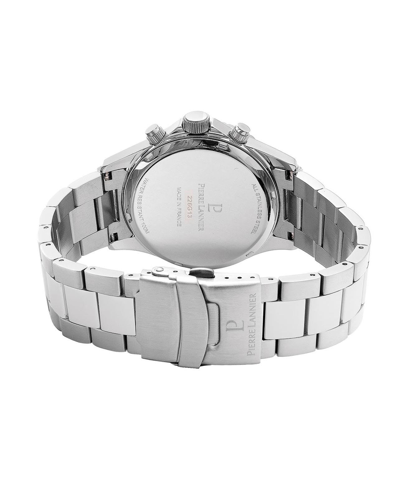 Мужские кварцевые часы Pierre Lannier Cronos 226G131. Часы-хронографХронографФункция позволяет измерять отрезки времени с особой точностью: часы, минуты, секунды. Верным признаком хронографа является наличие на циферблате 3 дополнительных окошек-счётчиков. с секундомеромСекундомерСекундоме́р — прибор, способный измерять интервалы времени с точностью до долей секунды.. Минеральное стеклоМинеральное стеклоМинеральное стекло представляет собой искусственно выращенный минерал кварца. Такое стекло отличается особой устойчивостью к повреждениям и царапинам. Уступает по некоторым качествам сапфировому стеклу. устойчивое к мелким механическим повреждениям. Корпус из нержавеющей стали. БезельБезельВнешний ободок, закрепляющий стекло. В спортивных часах так называется поворотное кольцо с делениями на циферблате, выполняет роль таймера – замеряет отрезки времени на шкале. Неподвижный безель – элемент декора. Однонаправленно вращающийся безель на дайверских часах позволяет фиксировать моменты погружения и выныривания на поверхность. из нержавющей стали с IP-покрытиемIP-покрытиеМетод ионного напыления. Демонстрирует повышенную устойчивость к истиранию, окислению и химическим веществам. Под воздействием высокого давления и температуры около 1500°C молекулы металла надёжно соединяются с частицами корпуса часов.. Центральные часовая и минутная стрелки, секундная стрелка вынесена на малый циферблат. Окошко даты между 4 и 5 часам. Стрелки с люминесцентным покрытиемЛюминесцентное покрытиеПозволяет считывать показания времени в темноте. Производители наносят на стрелки, часовые индексы, безель или поверхность циферблата светонакопительный состав, дающий холодное свечение.. Водостойкость: 100 метров, позволит плавать, нырять и заниматься другими водными видами спорта. Стальной браслет с раскладной застёжкойРаскладная застёжкаТакой тип застёжки используется только на браслетах из металла. Она никогда не раскрывается полностью, происходит разделение на 2 и более частей. Раскладывающая застёжка снизит вероятность потери часов к минимуму..