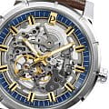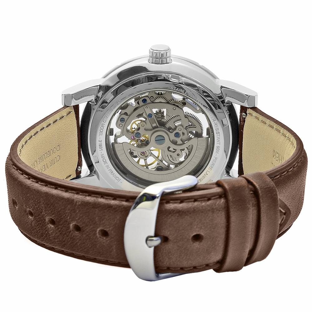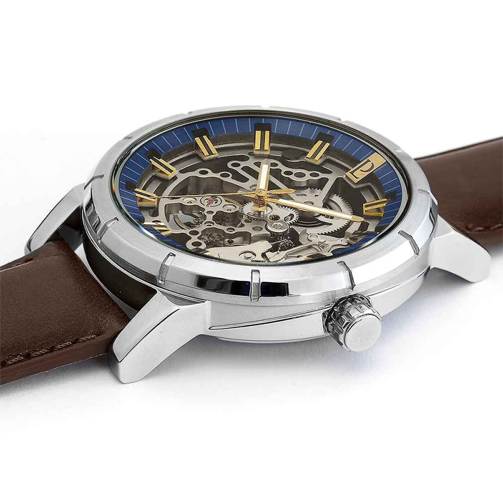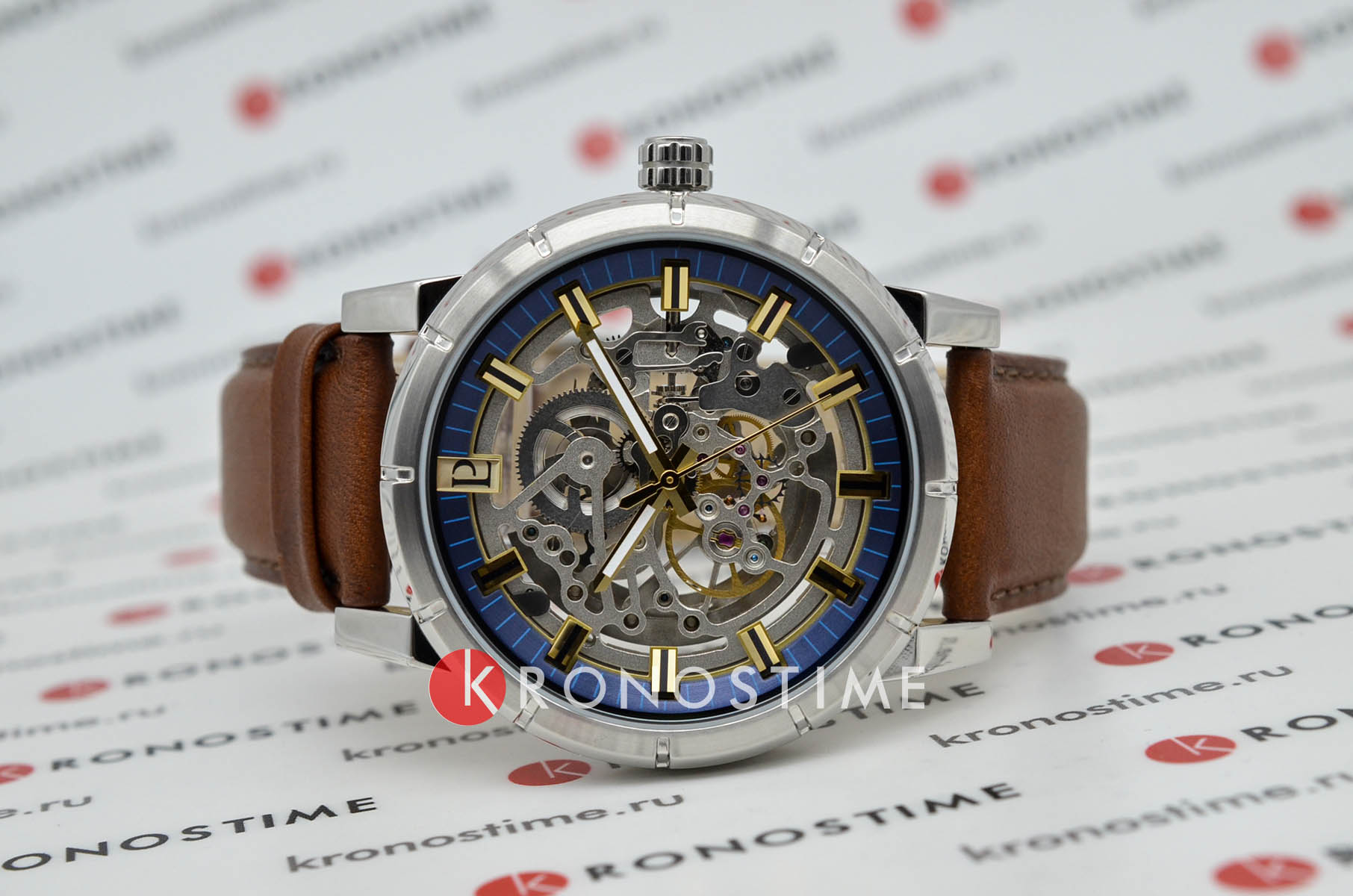 Мужские механические часы с автоподзаводом Pierre Lannier Automatic 319B164. Минеральное стеклоМинеральное стеклоМинеральное стекло представляет собой искусственно выращенный минерал кварца. Такое стекло отличается особой устойчивостью к повреждениям и царапинам. Уступает по некоторым качествам сапфировому стеклу. устойчивое к мелким механическим повреждениям. Центральные часовая, минутная и секундная стрелки. Корпус выполнен из нержавеющей стали. Водостойкость: 50 метров, позволит защитить корпус от случайных брызг или капель дождя. Кожаный ремешок на стандартной застёжке. Стрелки с люминесцентным покрытиемЛюминесцентное покрытиеПозволяет считывать показания времени в темноте. Производители наносят на стрелки, часовые индексы, безель или поверхность циферблата светонакопительный состав, дающий холодное свечение.. Синий скелетонизированный циферблат. Прозрачная задняя крышка.