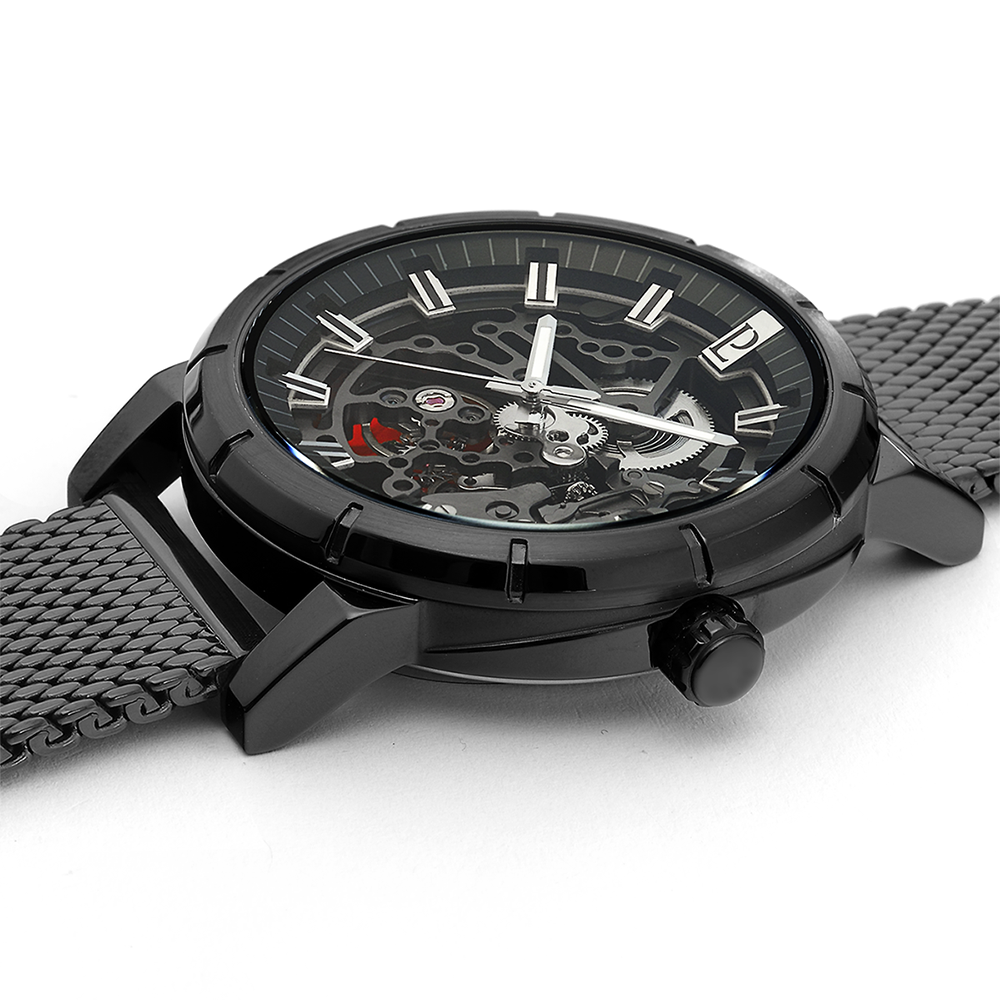 Мужские механические часы с автоподзаводом Pierre Lannier Automatic 321C438. Минеральное стеклоМинеральное стеклоМинеральное стекло представляет собой искусственно выращенный минерал кварца. Такое стекло отличается особой устойчивостью к повреждениям и царапинам. Уступает по некоторым качествам сапфировому стеклу. устойчивое к мелким механическим повреждениям. Центральные часовая, минутная и секундная стрелки. Корпус и браслет выполнены из нержавеющей стали с IP-покрытиемIP-покрытиеМетод ионного напыления. Демонстрирует повышенную устойчивость к истиранию, окислению и химическим веществам. Под воздействием высокого давления и температуры около 1500°C молекулы металла надёжно соединяются с частицами корпуса часов.. Водостойкость: 50 метров, позволит защитить корпус от случайных брызг или капель дождя. Стрелки с люминесцентным покрытиемЛюминесцентное покрытиеПозволяет считывать показания времени в темноте. Производители наносят на стрелки, часовые индексы, безель или поверхность циферблата светонакопительный состав, дающий холодное свечение.. Черный скелетонизированный циферблат. Браслет на раскладной застёжкеРаскладная застёжкаТакой тип застёжки используется только на браслетах из металла. Она никогда не раскрывается полностью, происходит разделение на 2 и более частей. Раскладывающая застёжка снизит вероятность потери часов к минимуму.. Прозрачная задняя крышка.