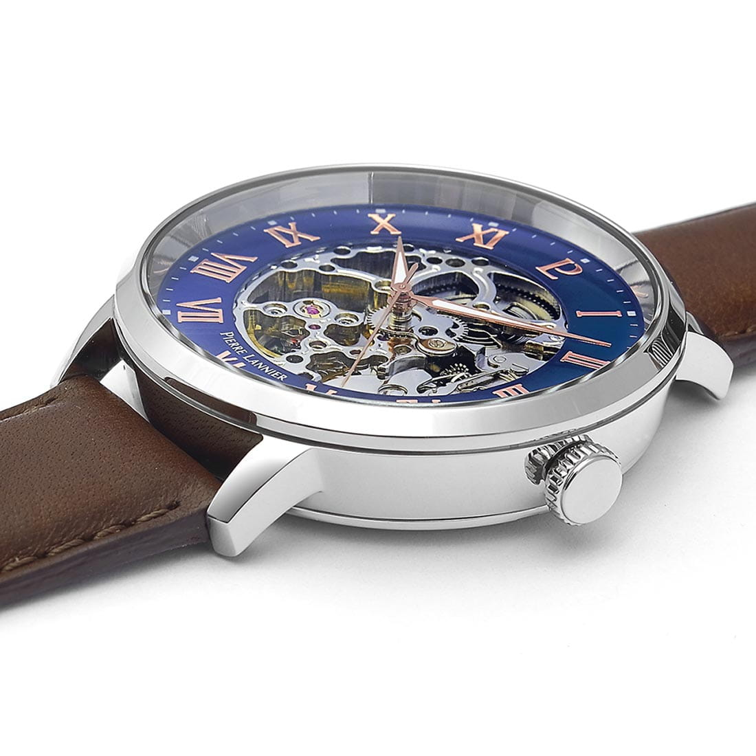 Мужские механические часы с автоподзаводом Pierre Lannier Automatic 322B164. Минеральное стеклоМинеральное стеклоМинеральное стекло представляет собой искусственно выращенный минерал кварца. Такое стекло отличается особой устойчивостью к повреждениям и царапинам. Уступает по некоторым качествам сапфировому стеклу. устойчивое к мелким механическим повреждениям. Скелетонизированный циферблат. Центральные часовая, минутная и секундная стрелки. Стрелки с люминесцентным покрытиемЛюминесцентное покрытиеПозволяет считывать показания времени в темноте. Производители наносят на стрелки, часовые индексы, безель или поверхность циферблата светонакопительный состав, дающий холодное свечение.. Корпус выполнен из нержавеющей стали. Диаметр корпуса составляет 42 мм, толщина 13.5 мм. Кожаный ремешок черного цвета.Водостойкость WR 50.