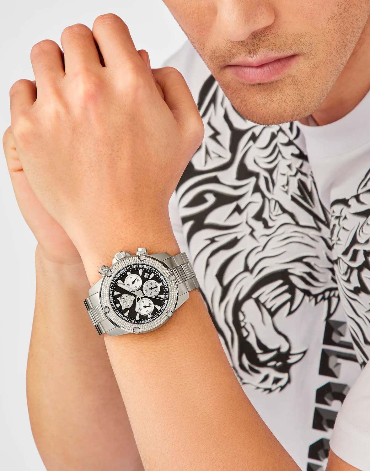Немецкие мужские кварцевые часы-хронографХронографФункция позволяет измерять отрезки времени с особой точностью: часы, минуты, секунды. Верным признаком хронографа является наличие на циферблате 3 дополнительных окошек-счётчиков. с секундомеромСекундомерСекундоме́р — прибор, способный измерять интервалы времени с точностью до долей секунды. Plein Sport Hurricane PSDBA0823, кварцевый механизм с высокой точностью. Класс водозащиты: 50 метров, позволит защитить корпус от случайных брызг или капель дождя. Корпус выполнен из стали. Стальной браслет на раскладной застёжкеРаскладная застёжкаТакой тип застёжки используется только на браслетах из металла. Она никогда не раскрывается полностью, происходит разделение на 2 и более частей. Раскладывающая застёжка снизит вероятность потери часов к минимуму.. Минеральное стеклоМинеральное стеклоМинеральное стекло представляет собой искусственно выращенный минерал кварца. Такое стекло отличается особой устойчивостью к повреждениям и царапинам. Уступает по некоторым качествам сапфировому стеклу. устойчивое к мелким механическим повреждениям. Окошко даты находится в положении между 4 и 5 часов.