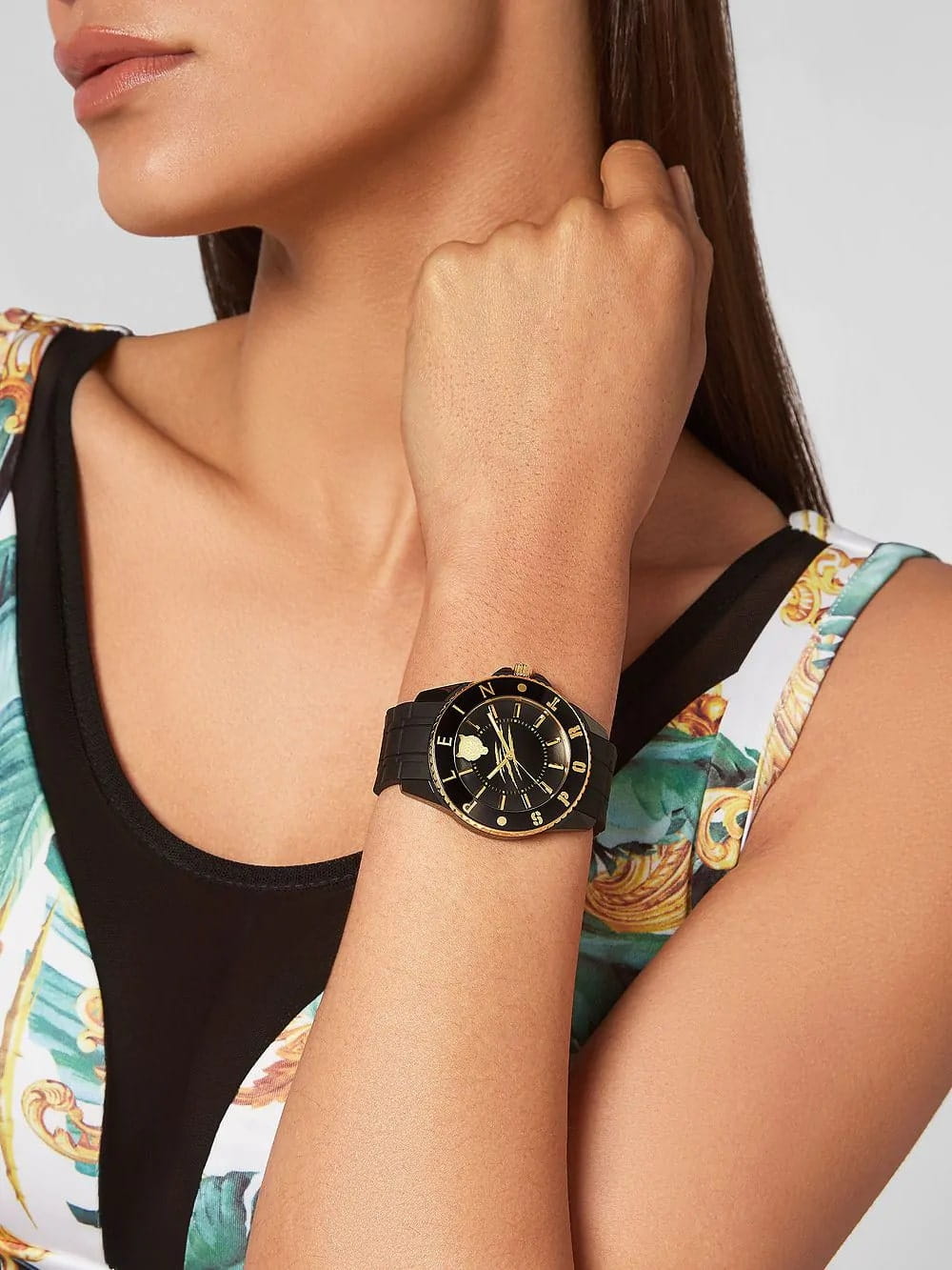 Немецкие женские кварцевые часы с минеральным стекломМинеральное стеклоМинеральное стекло представляет собой искусственно выращенный минерал кварца. Такое стекло отличается особой устойчивостью к повреждениям и царапинам. Уступает по некоторым качествам сапфировому стеклу. Plein Sport Glam PSKBA0323, кварцевый механизм с высокой точностью. Класс водозащиты: 50 метров, позволит защитить корпус от случайных брызг или капель дождя. Корпус часов изготовлен из стали  с IP-покрытиемIP-покрытиеМетод ионного напыления. Демонстрирует повышенную устойчивость к истиранию, окислению и химическим веществам. Под воздействием высокого давления и температуры около 1500°C молекулы металла надёжно соединяются с частицами корпуса часов.. Силиконовый ремешок на стандартной застёжке. БезельБезельВнешний ободок, закрепляющий стекло. В спортивных часах так называется поворотное кольцо с делениями на циферблате, выполняет роль таймера – замеряет отрезки времени на шкале. Неподвижный безель – элемент декора. Однонаправленно вращающийся безель на дайверских часах позволяет фиксировать моменты погружения и выныривания на поверхность. с IP-покрытиемIP-покрытиеМетод ионного напыления. Демонстрирует повышенную устойчивость к истиранию, окислению и химическим веществам. Под воздействием высокого давления и температуры около 1500°C молекулы металла надёжно соединяются с частицами корпуса часов.. Стрелки с люминесцентным покрытиемЛюминесцентное покрытиеПозволяет считывать показания времени в темноте. Производители наносят на стрелки, часовые индексы, безель или поверхность циферблата светонакопительный состав, дающий холодное свечение..