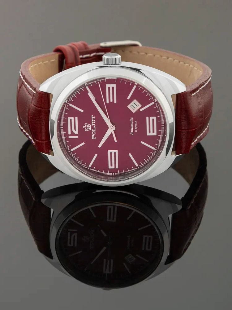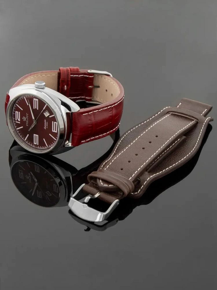 Poljot 8215.241269 — элегантные механические часы с автоподзаводом, сочетающем силу и изысканность. Корпус из нержавеющей стали подчеркивает надёжность и лаконичность дизайна, а глубокий циферблат с серебристыми стрелками и крупными арабскими цифрами придаёт модели благородный акцент. Проверенный японский механизм Miyota 8215 обеспечивает точность хода и долговечность, а плавное движение секундной стрелки подчёркивает качество сборки. Метки и стрелки с люминесцентным покрытиемЛюминесцентное покрытиеПозволяет считывать показания времени в темноте. Производители наносят на стрелки, часовые индексы, безель или поверхность циферблата светонакопительный состав, дающий холодное свечение. обеспечивают отличную читаемость при любом освещении, а окно даты добавляет практичности. Прочное минеральное стеклоМинеральное стеклоМинеральное стекло представляет собой искусственно выращенный минерал кварца. Такое стекло отличается особой устойчивостью к повреждениям и царапинам. Уступает по некоторым качествам сапфировому стеклу. защищает циферблат от царапин, а ремешок из натуральной кожи в тон циферблату завершает утончённый облик модели. Poljot — гармония классики и современной механики, созданная для тех, кто ценит традиции и индивидуальность в каждой детали. В комплекте дополнительный ремешок с напульсником.