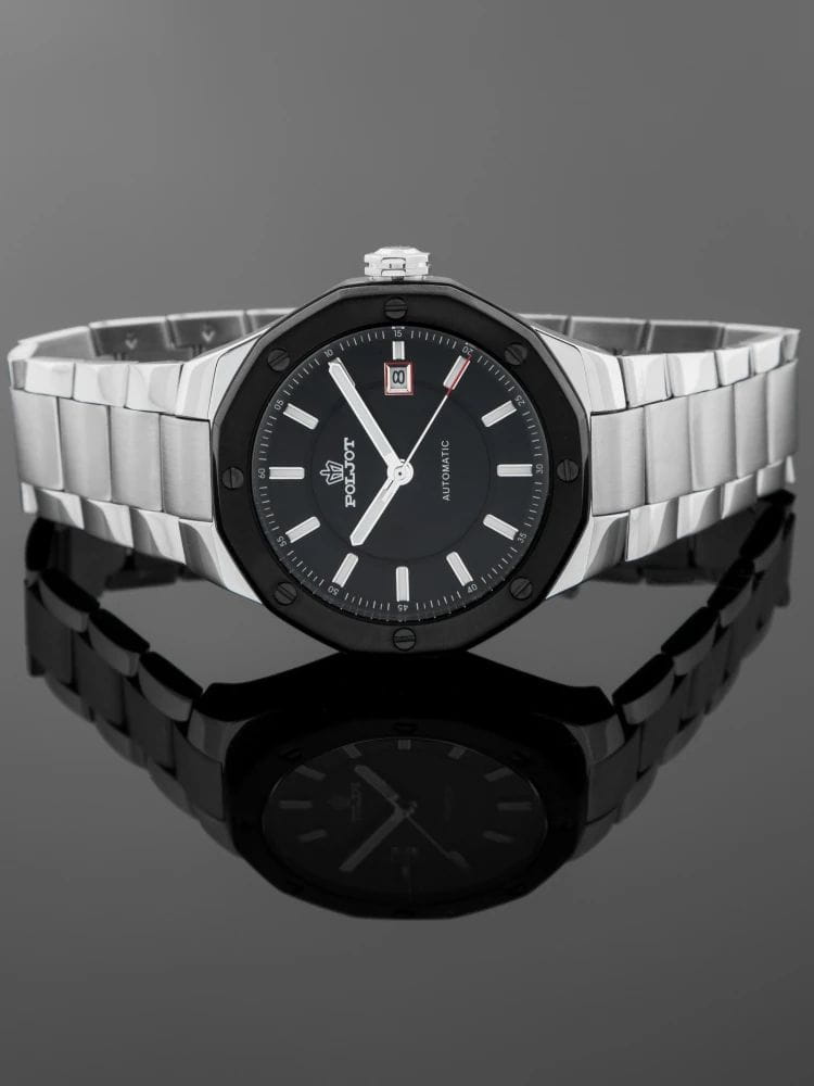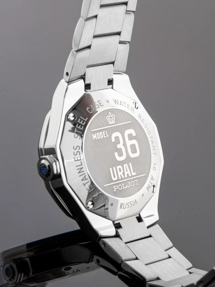Poljot Ural 8215.363247Б — стильные механические часы с автоподзаводом, сочетающие брутальный характер и современную элегантность. Корпус выполнен из нержавеющей стали, что придаёт модели монолитность и прочность, а глубокий циферблат подчеркивает премиальный облик. Стальной браслет на застёжке-бабочке с кнопкамиЗастёжка "бабочка"Такой вид застёжки дополняется предохранителями, помогающими избежать случайного раскрытия браслета. Обладают изящным исполнением. . БезельБезельВнешний ободок, закрепляющий стекло. В спортивных часах так называется поворотное кольцо с делениями на циферблате, выполняет роль таймера – замеряет отрезки времени на шкале. Неподвижный безель – элемент декора. Однонаправленно вращающийся безель на дайверских часах позволяет фиксировать моменты погружения и выныривания на поверхность. с PVD-покрытиемPVDУльтратонкое покрытие наносится в технике вакуумного напыления, сочетает в себе нитрид титана особой прочности со слоем золота или оксида хрома. Несёт в себе декоративную или защитную функцию.. Внутри установлен надёжный японский механизм Miyota 8215, обеспечивающий точный ход и плавную работу стрелок. Широкие метки и стрелки с люминесцентным покрытиемЛюминесцентное покрытиеПозволяет считывать показания времени в темноте. Производители наносят на стрелки, часовые индексы, безель или поверхность циферблата светонакопительный состав, дающий холодное свечение. гарантируют превосходную читаемость в любое время суток, а окно даты добавляет удобства. Прочное минеральное стеклоМинеральное стеклоМинеральное стекло представляет собой искусственно выращенный минерал кварца. Такое стекло отличается особой устойчивостью к повреждениям и царапинам. Уступает по некоторым качествам сапфировому стеклу. защищает циферблат от повреждений, а водонепроницаемость до 10 бар делает часы надёжным спутником как в деловом, так и активном образе жизни. Poljot Ural — воплощение силы, точности и мужского стиля, созданное для тех, кто ценит механику и уверенность в каждой детали.
