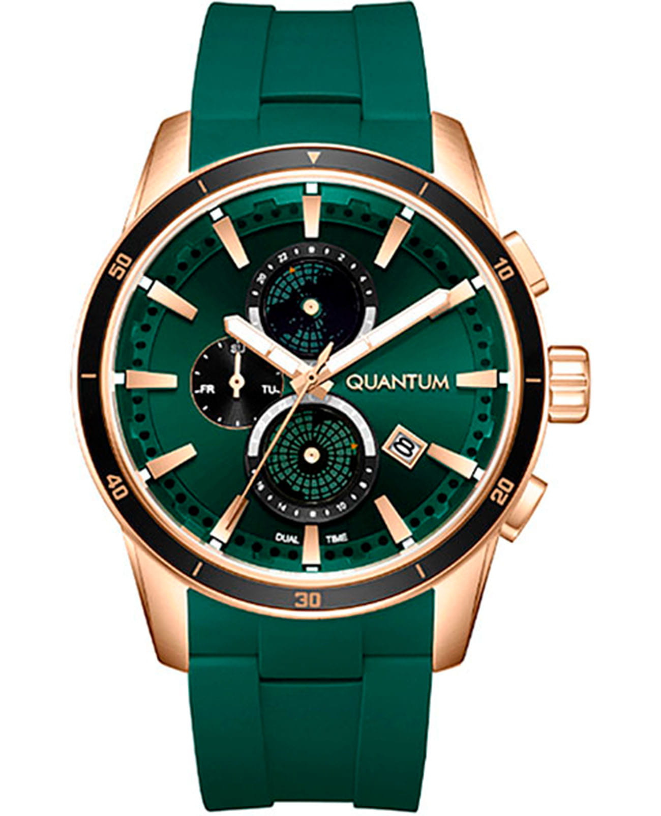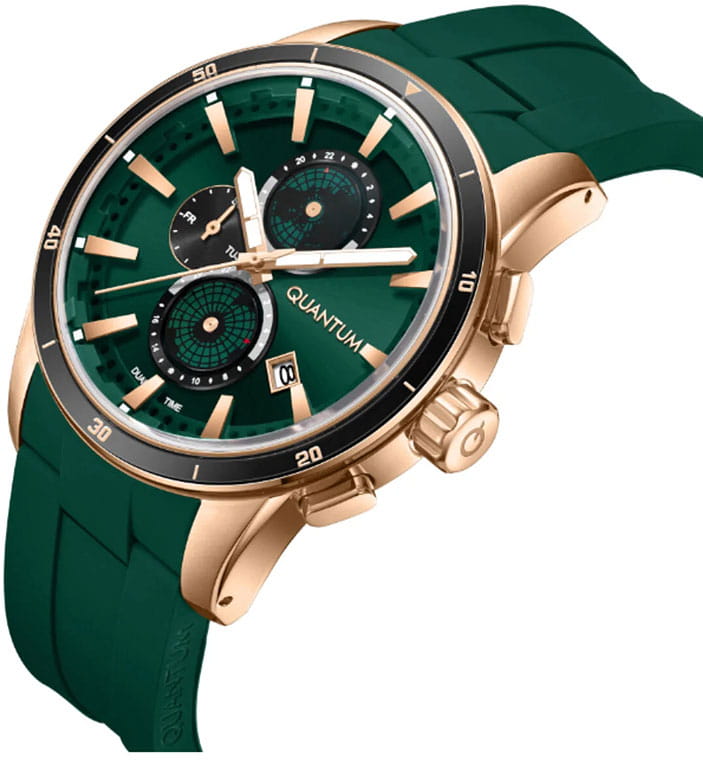 Мужские кварцевые часы Quantum ADG991.475 из коллекции Adrenaline — смелый спортивный акцент с функцией двойного времени. Корпус круглый, из нержавеющей стали с PVD-покрытиемPVDУльтратонкое покрытие наносится в технике вакуумного напыления, сочетает в себе нитрид титана особой прочности со слоем золота или оксида хрома. Несёт в себе декоративную или защитную функцию. цвета розового золота, диаметром 47 мм. Циферблат — зелёный с индикацией даты, дня недели и второго часового поясаВторой часовой поясФункция, позволяющая отображать время двух часовых поясов одновременно.. Стекло — минеральноеМинеральное стеклоМинеральное стекло представляет собой искусственно выращенный минерал кварца. Такое стекло отличается особой устойчивостью к повреждениям и царапинам. Уступает по некоторым качествам сапфировому стеклу. с антибликовым покрытием. Водонепроницаемость 100 м. Ремешок — зелёный силиконовый на стандартной застёжке. Идеальный выбор для тех, кто ценит турецкий дизайн и активный образ жизни.