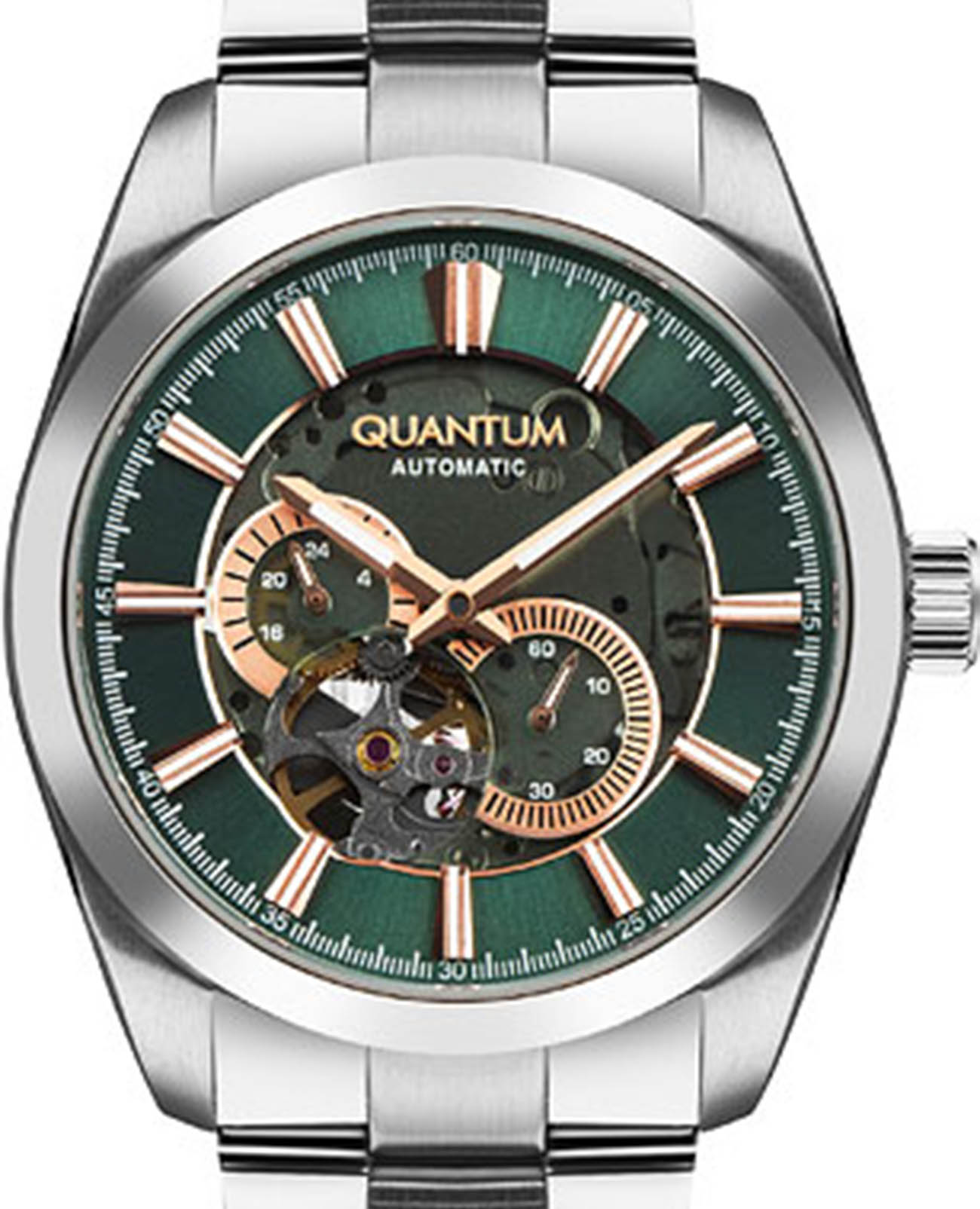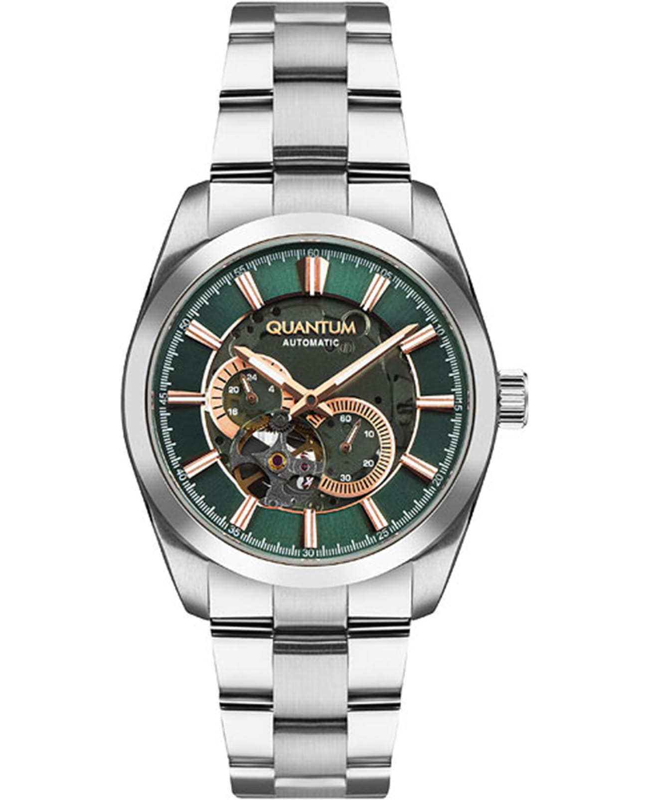 Мужские механические часы Quantum QMG1132.370 с автоподзаводом — это стильный и надёжный аксессуар, выполненный в круглой форме из нержавеющей стали. Модель гарантирует точность и долговечность. Скелетонизированный циферблат позволяет увидеть внутреннюю конструкцию механизма, а сапфировое стеклоСапфировое стеклоПрочный и надёжный материал из кристалла сапфира синтетического происхождения, характеризующийся особой твёрдостью и устойчивостью к царапинам и повреждениям. обеспечивает защиту от царапин и механических повреждений. Циферблат зелёного цвета дополнен секундной стрелкой и имеет элегантную отделку. Браслет серебряного цвета шириной 22 мм изготовлен из стали и оснащён Раскладная застёжкаРаскладная застёжкаТакой тип застёжки используется только на браслетах из металла. Она никогда не раскрывается полностью, происходит разделение на 2 и более частей. Раскладывающая застёжка снизит вероятность потери часов к минимуму., что делает его удобным для ношения и подчёркивает стиль и качество модели. Водонепроницаемость позволяет использовать часы при плавании и других водных активностях без глубокого погружения. Эти часы станут универсальным аксессуаром для тех, кто ценит сочетание функциональности, качества и эстетики — идеальный выбор для повседневной носки и деловых встреч.