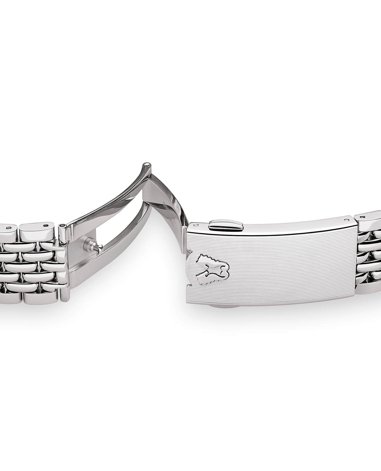 Стильная модель с компактным корпусом станет отличным вариантом на все случаи жизни, идеально смотрится тёмно-синий циферблат с контрастными стрелками и метками. Наручные часы сделаны из хирургической стали 316L, исключение составляет фигурный безельБезельВнешний ободок, закрепляющий стекло. В спортивных часах так называется поворотное кольцо с делениями на циферблате, выполняет роль таймера – замеряет отрезки времени на шкале. Неподвижный безель – элемент декора. Однонаправленно вращающийся безель на дайверских часах позволяет фиксировать моменты погружения и выныривания на поверхность. из инновационной плазменной керамикиВысокотехнологичная плазменная керамикаИнновационный материал, технология запатентована. Выплавление керамики осуществляется в печи при 20 000 °C, белоснежный материал под воздействием ультравысокой температуры приобретает уникальный блеск, присущий металлам.. Пружинный механизм ETA 2671 отличается запасом хода до 38 часов, за работой которого можно понаблюдать сквозь прозрачную заднюю крышку. Сапфировое стекло имеет антибликовое покрытие. Водостойкость WR 50. . Индикация даты. Диаметр корпуса: 36,5 мм.