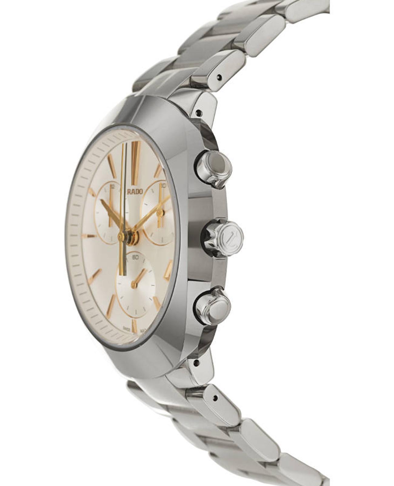 Мужские швейцарские часы-хронографХронографФункция позволяет измерять отрезки времени с особой точностью: часы, минуты, секунды. Верным признаком хронографа является наличие на циферблате 3 дополнительных окошек-счётчиков. Rado D-Star Chronograph R15937113. Сапфировое стеклоСапфировое стеклоПрочный и надёжный материал из кристалла сапфира синтетического происхождения, характеризующийся особой твёрдостью и устойчивостью к царапинам и повреждениям. устойчивое к мелким механическим повреждениям. Корпус часов изготовлен из CeramosCeramosМатериал являет собой инновационное сочетание высокотехнологичной керамики и сплава металла. Он объединяет керамическую устойчивость к царапинам и металлический роскошный блеск. . Класс водозащиты: 100 метров, позволит плавать, нырять и заниматься другими водными видами спорт. Браслет из нержавеющей стали на раскладной застёжкеРаскладная застёжкаТакой тип застёжки используется только на браслетах из металла. Она никогда не раскрывается полностью, происходит разделение на 2 и более частей. Раскладывающая застёжка снизит вероятность потери часов к минимуму..