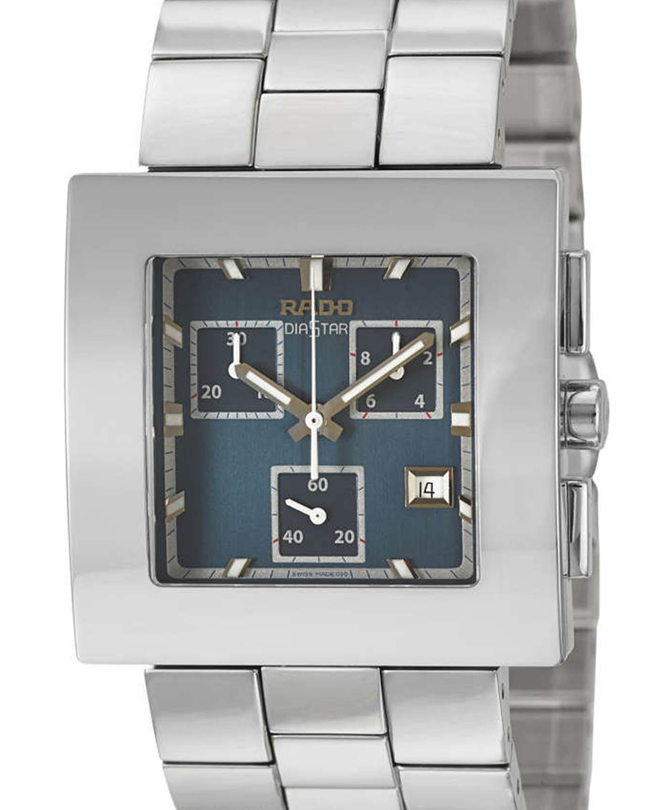 Мужские швейцарские часы-хронографХронографФункция позволяет измерять отрезки времени с особой точностью: часы, минуты, секунды. Верным признаком хронографа является наличие на циферблате 3 дополнительных окошек-счётчиков. Rado DiaStar R18683203. Сапфировое стеклоСапфировое стеклоПрочный и надёжный материал из кристалла сапфира синтетического происхождения, характеризующийся особой твёрдостью и устойчивостью к царапинам и повреждениям. устойчивое к мелким механическим повреждениям. Корпус часов изготовлен из нержавеющей стали. Окошко даты находится в положении 4 часа. Стрелки с люминесцентным покрытиемЛюминесцентное покрытиеПозволяет считывать показания времени в темноте. Производители наносят на стрелки, часовые индексы, безель или поверхность циферблата светонакопительный состав, дающий холодное свечение.. Класс водозащиты: 30 метров, позволит защитить корпус от случайных брызг или капель дождя. Стальной браслет на раскладной застёжкеРаскладная застёжкаТакой тип застёжки используется только на браслетах из металла. Она никогда не раскрывается полностью, происходит разделение на 2 и более частей. Раскладывающая застёжка снизит вероятность потери часов к минимуму..