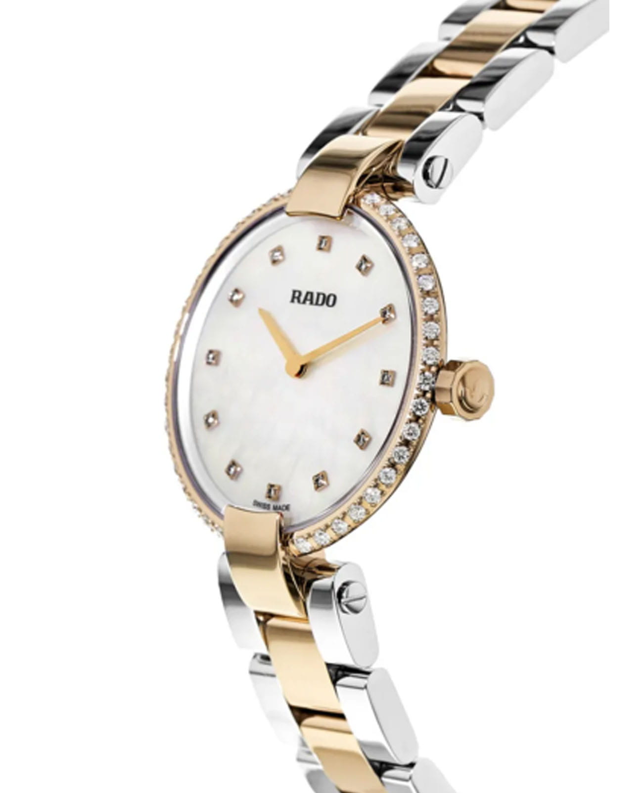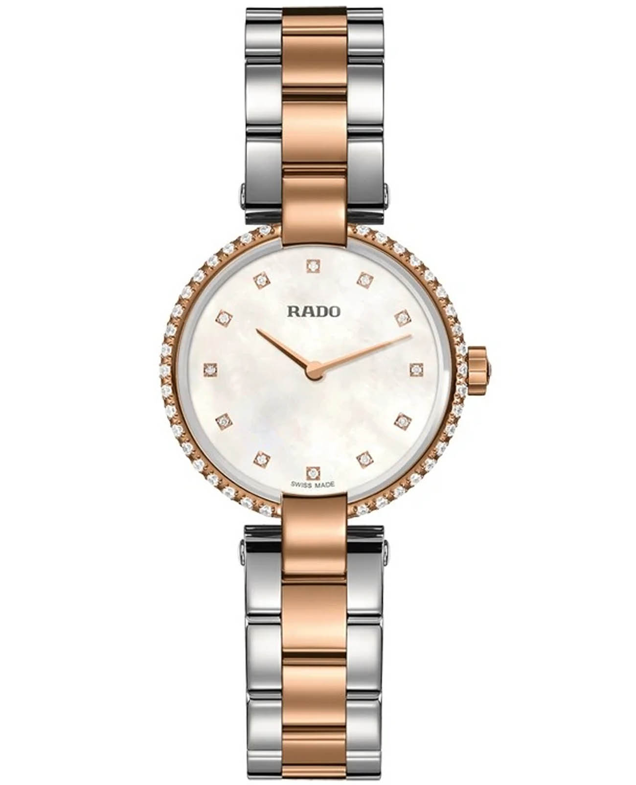 Швейцарские женские часы Rado Coupole Classic Diamonds R22859923, кварцевый механизм с высокой точностью. Сапфировое стеклоСапфировое стеклоПрочный и надёжный материал из кристалла сапфира синтетического происхождения, характеризующийся особой твёрдостью и устойчивостью к царапинам и повреждениям. устойчивое к появлению царапин, обладающее высокой прозрачностью. Корпус часов изготовлен из стали. БезельБезельВнешний ободок, закрепляющий стекло. В спортивных часах так называется поворотное кольцо с делениями на циферблате, выполняет роль таймера – замеряет отрезки времени на шкале. Неподвижный безель – элемент декора. Однонаправленно вращающийся безель на дайверских часах позволяет фиксировать моменты погружения и выныривания на поверхность. с PVD-покрытиемPVDУльтратонкое покрытие наносится в технике вакуумного напыления, сочетает в себе нитрид титана особой прочности со слоем золота или оксида хрома. Несёт в себе декоративную или защитную функцию. украшен бриллиантами. Класс водозащиты: 50 метров, позволит защитить корпус от случайных брызг или капель дождя. Стальной браслет с частичным PVD-покрытиемPVDУльтратонкое покрытие наносится в технике вакуумного напыления, сочетает в себе нитрид титана особой прочности со слоем золота или оксида хрома. Несёт в себе декоративную или защитную функцию. на застёжке-бабочке с кнопкамиЗастёжка "бабочка"Такой вид застёжки дополняется предохранителями, помогающими избежать случайного раскрытия браслета. Обладают изящным исполнением. .