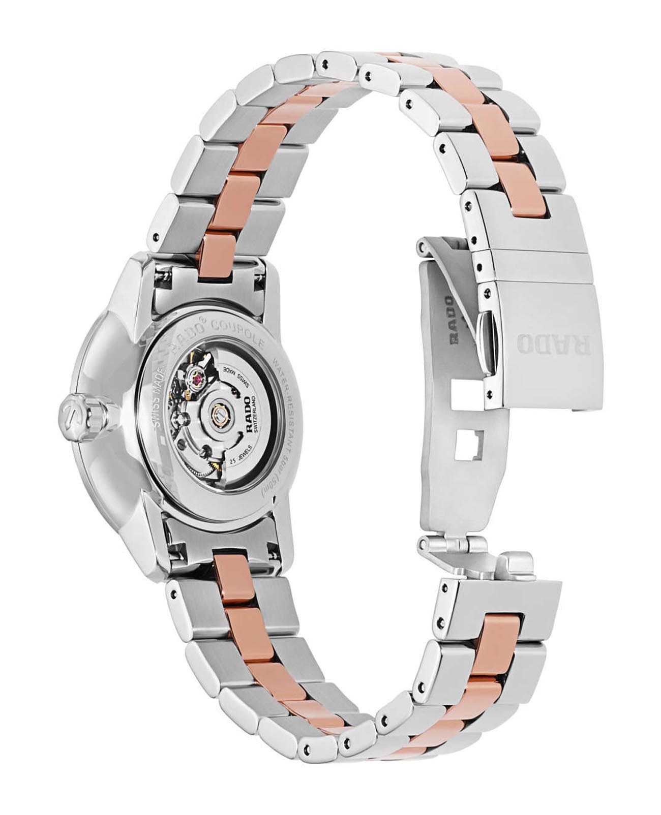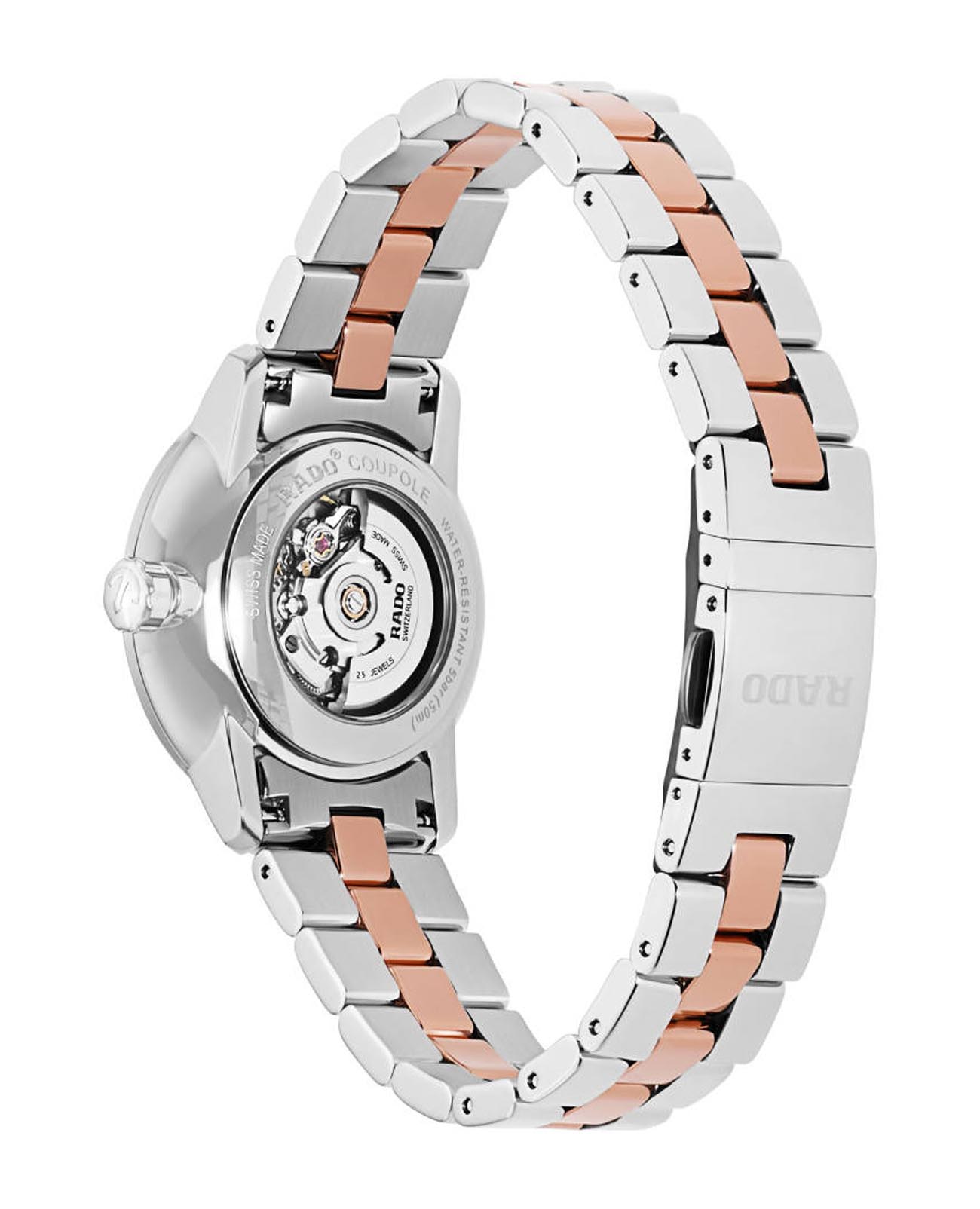 Женские механические швейцарские часы с автоподзаводом Rado Coupole Classic R22875752. Сапфировое стеклоСапфировое стеклоПрочный и надёжный материал из кристалла сапфира синтетического происхождения, характеризующийся особой твёрдостью и устойчивостью к царапинам и повреждениям. устойчивое к мелким механическим повреждениям. Корпус часов изготовлен из нержавеющей стали. БезельБезельВнешний ободок, закрепляющий стекло. В спортивных часах так называется поворотное кольцо с делениями на циферблате, выполняет роль таймера – замеряет отрезки времени на шкале. Неподвижный безель – элемент декора. Однонаправленно вращающийся безель на дайверских часах позволяет фиксировать моменты погружения и выныривания на поверхность. и циферблат украшены бриллинатами. Класс водозащиты: 100 метров, позволит плавать, нырять и заниматься другими водными видами спорта. Стальной браслет с кермическими вставками на раскладной застёжкеРаскладная застёжкаТакой тип застёжки используется только на браслетах из металла. Она никогда не раскрывается полностью, происходит разделение на 2 и более частей. Раскладывающая застёжка снизит вероятность потери часов к минимуму..